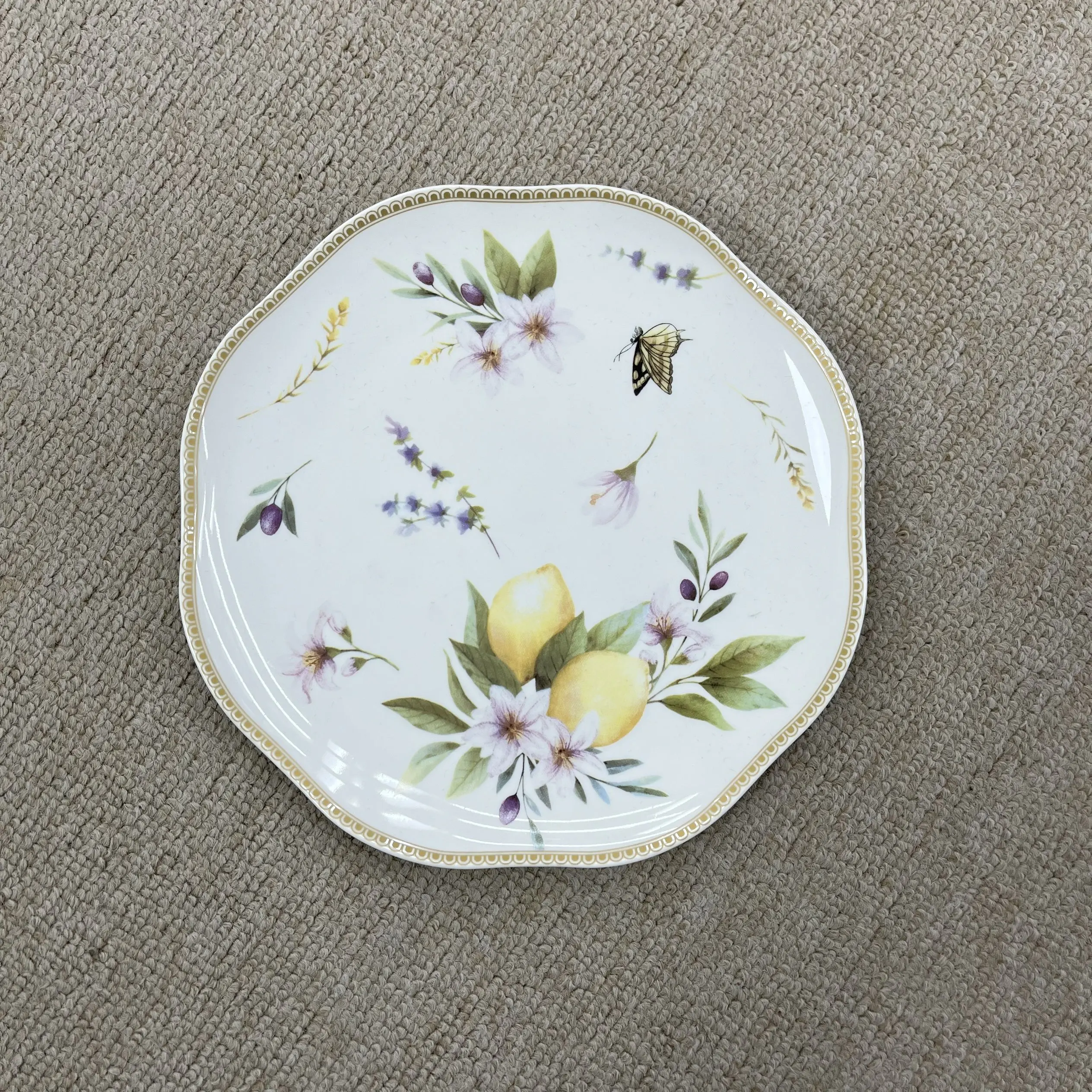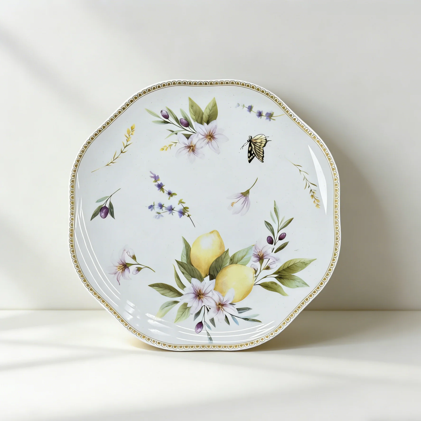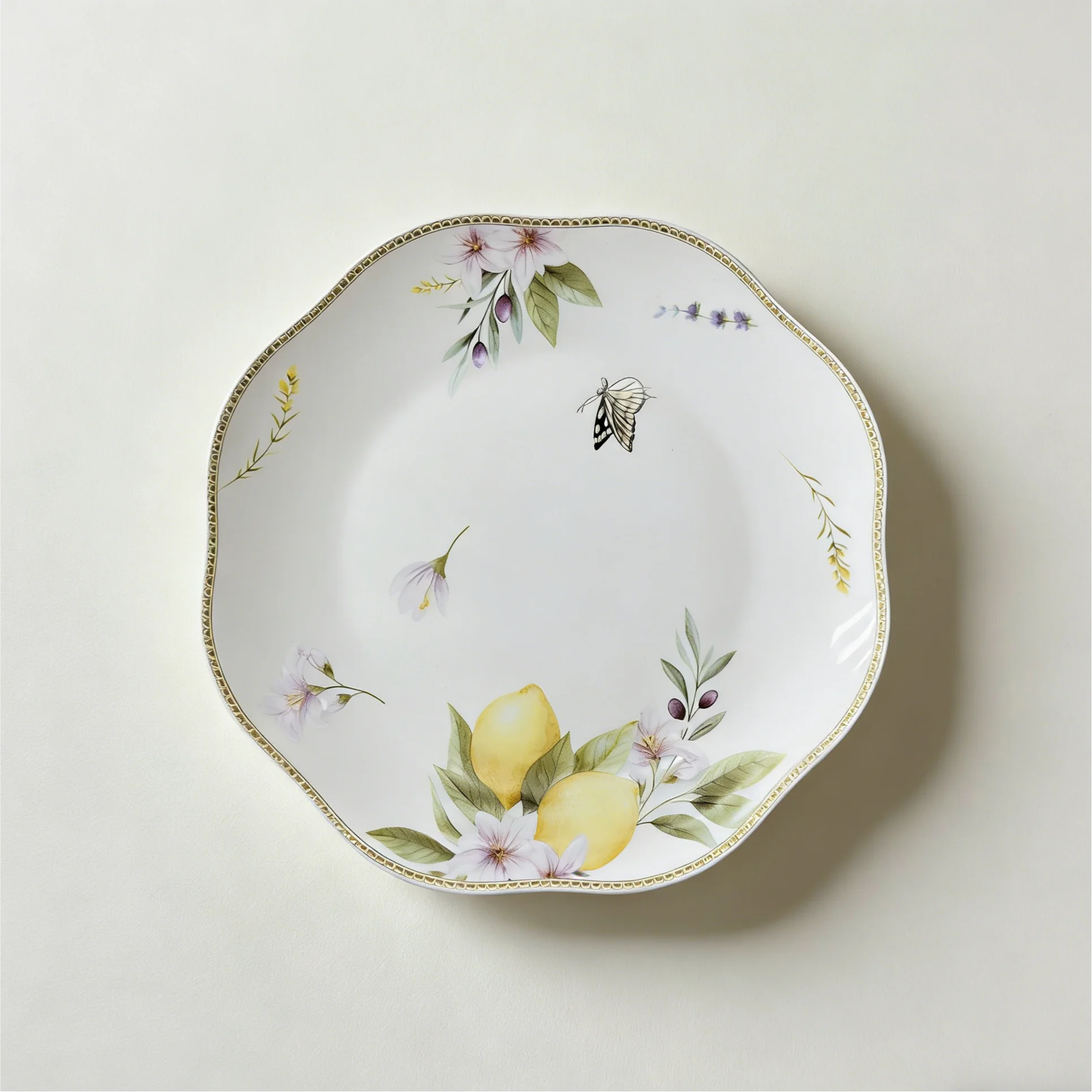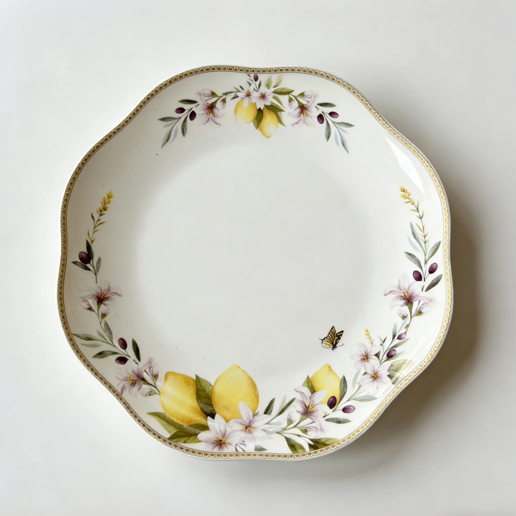 Κάθε λεία κεραμική πιάτο είναι διακοσμημένο με λεπτές, ανοιχτόχρωμες άνθη, μικρές πεταλούδες που φτερουγίζουν και λαμπερά, χαρούμενα στοιχεία λεμονιού—όλα τοποθετημένα μέσα σε ένα ζεστό, ρυζικό αγροτικό χάρισμα που νιώθει σαν μια αγκαλιά για το τραπέζι σας. Οι λεπτές φιμωτές άκρες και το παιχνιδιάρικο πιάτο με κίτρινες λωρίδες; Τέλεια επιλογή για να προσθέσετε μια αναπτερωτική απόχρωση χρώματος χωρίς να φαίνεται υπερβολικό.