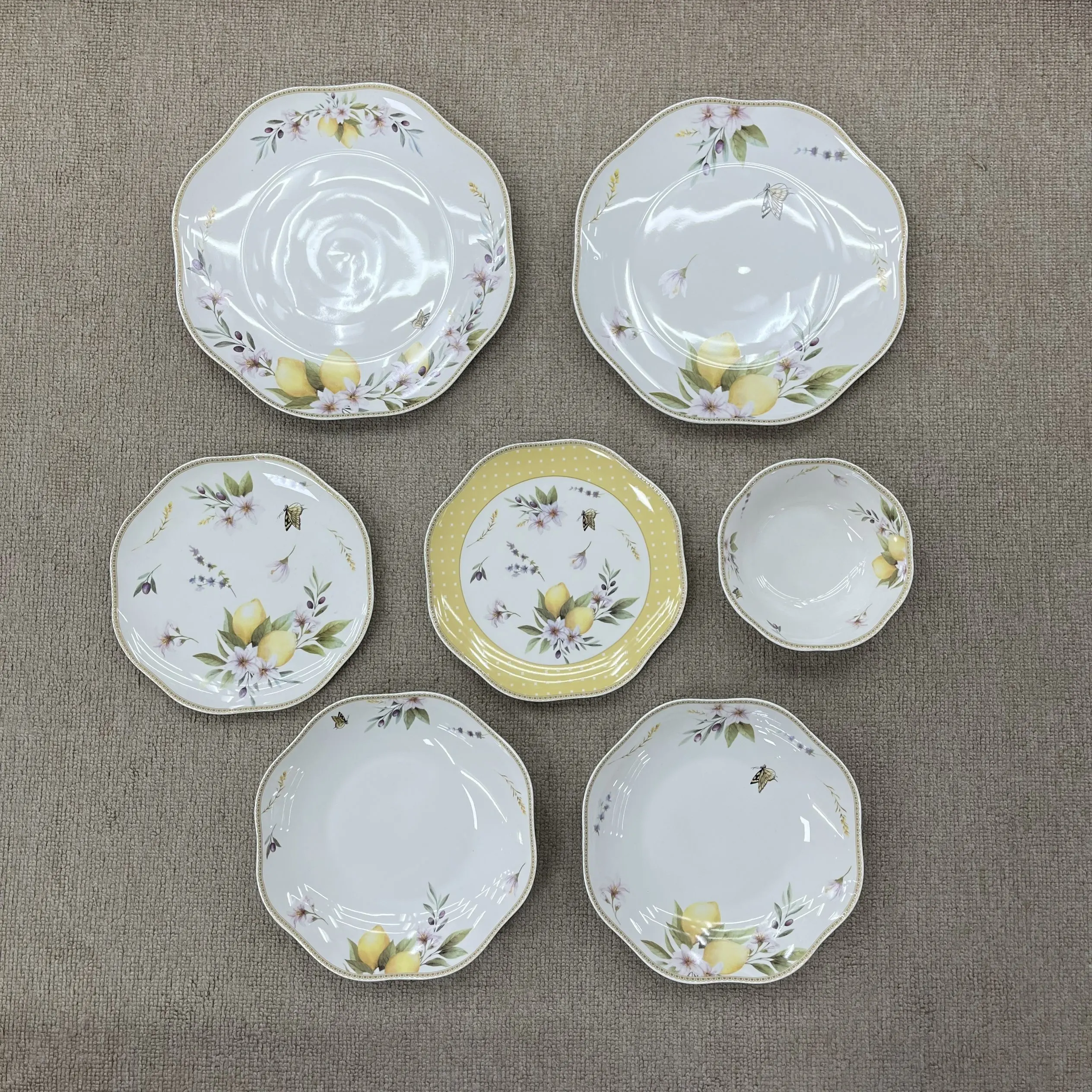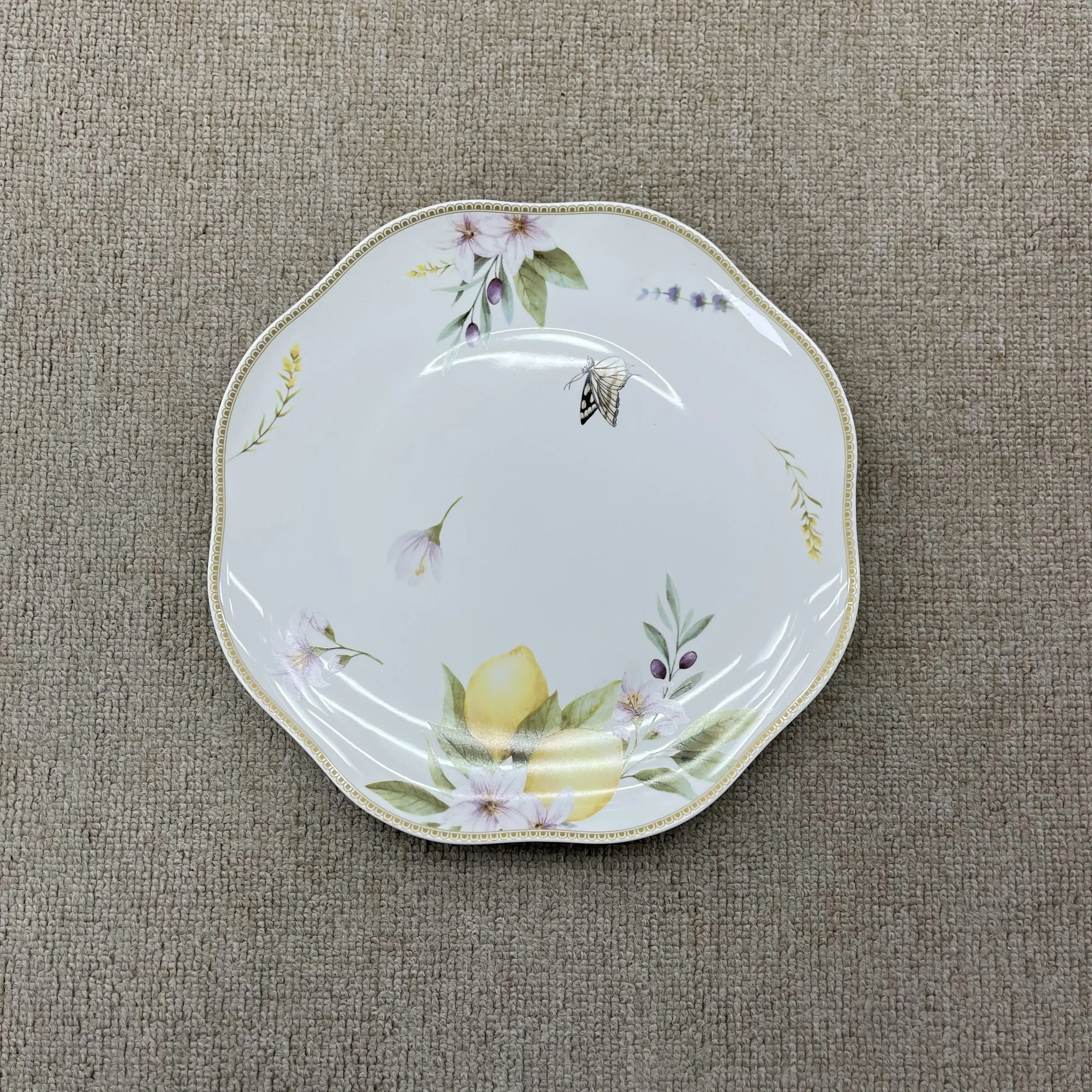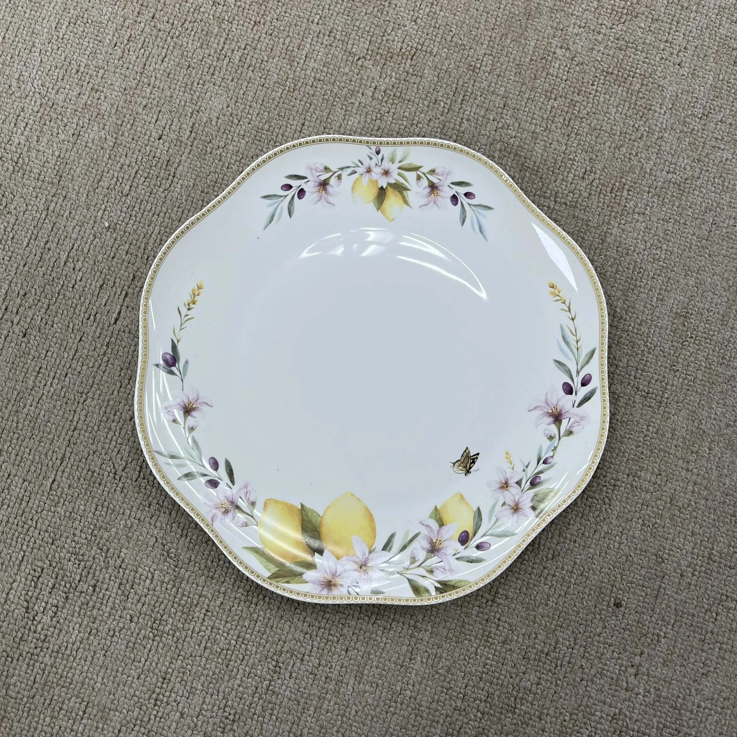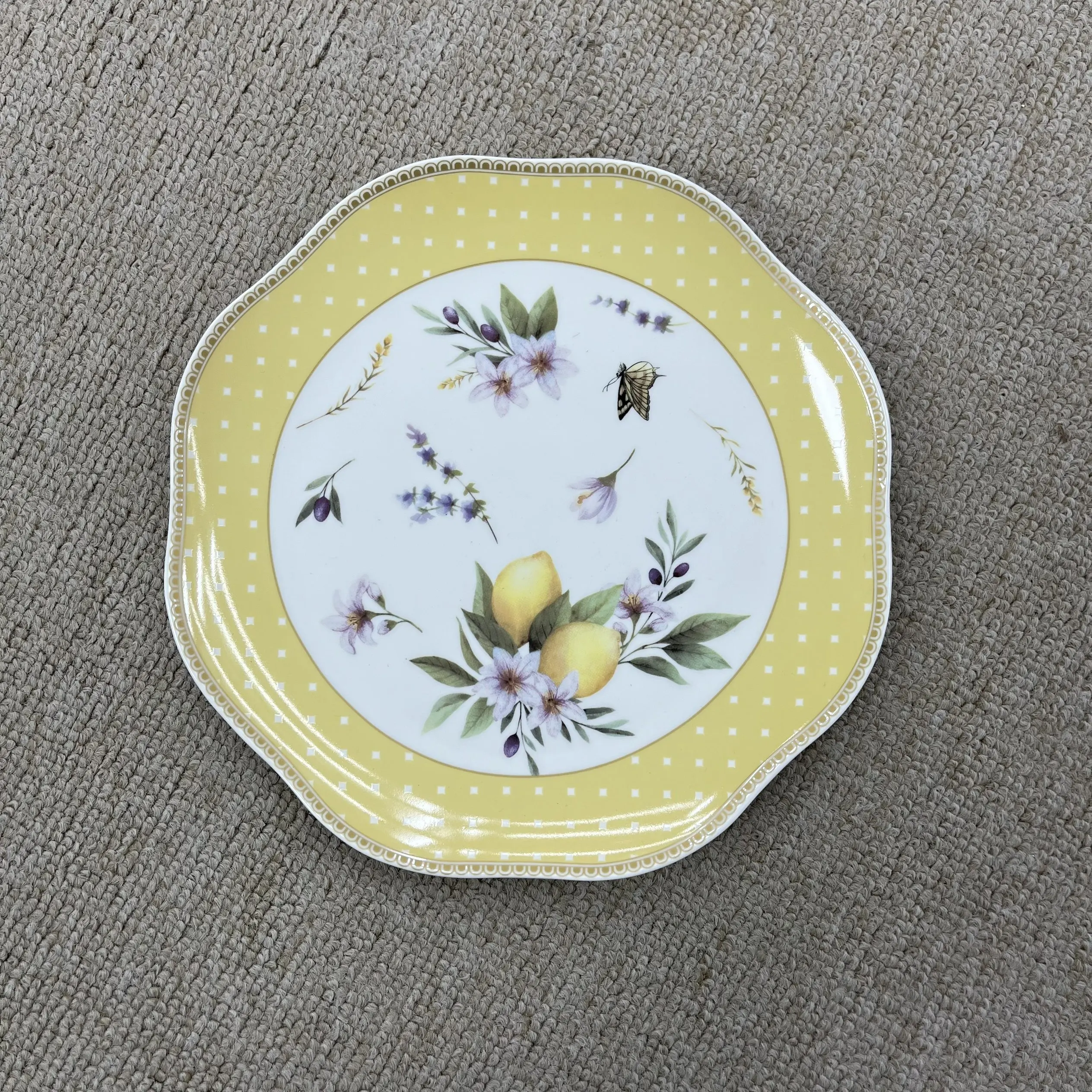 Κάθε λεία κεραμική πιάτο είναι διακοσμημένο με λεπτές, ανοιχτόχρωμες άνθη, μικρές πεταλούδες που φτερουγίζουν και λαμπερά, χαρούμενα στοιχεία λεμονιού—όλα τοποθετημένα μέσα σε ένα ζεστό, ρυζικό αγροτικό χάρισμα που νιώθει σαν μια αγκαλιά για το τραπέζι σας. Οι λεπτές φιμωτές άκρες και το παιχνιδιάρικο πιάτο με κίτρινες λωρίδες; Τέλεια επιλογή για να προσθέσετε μια αναπτερωτική απόχρωση χρώματος χωρίς να φαίνεται υπερβολικό.