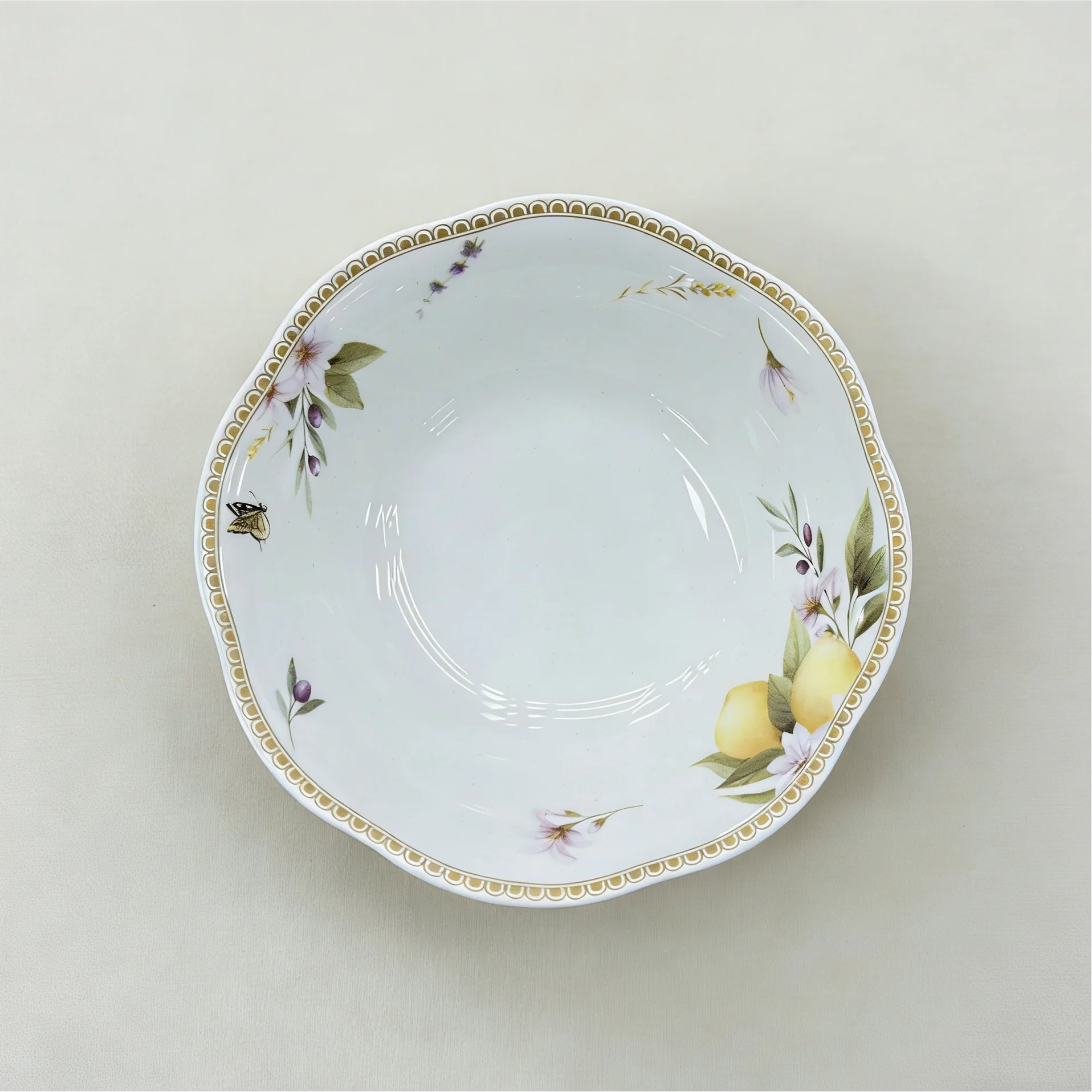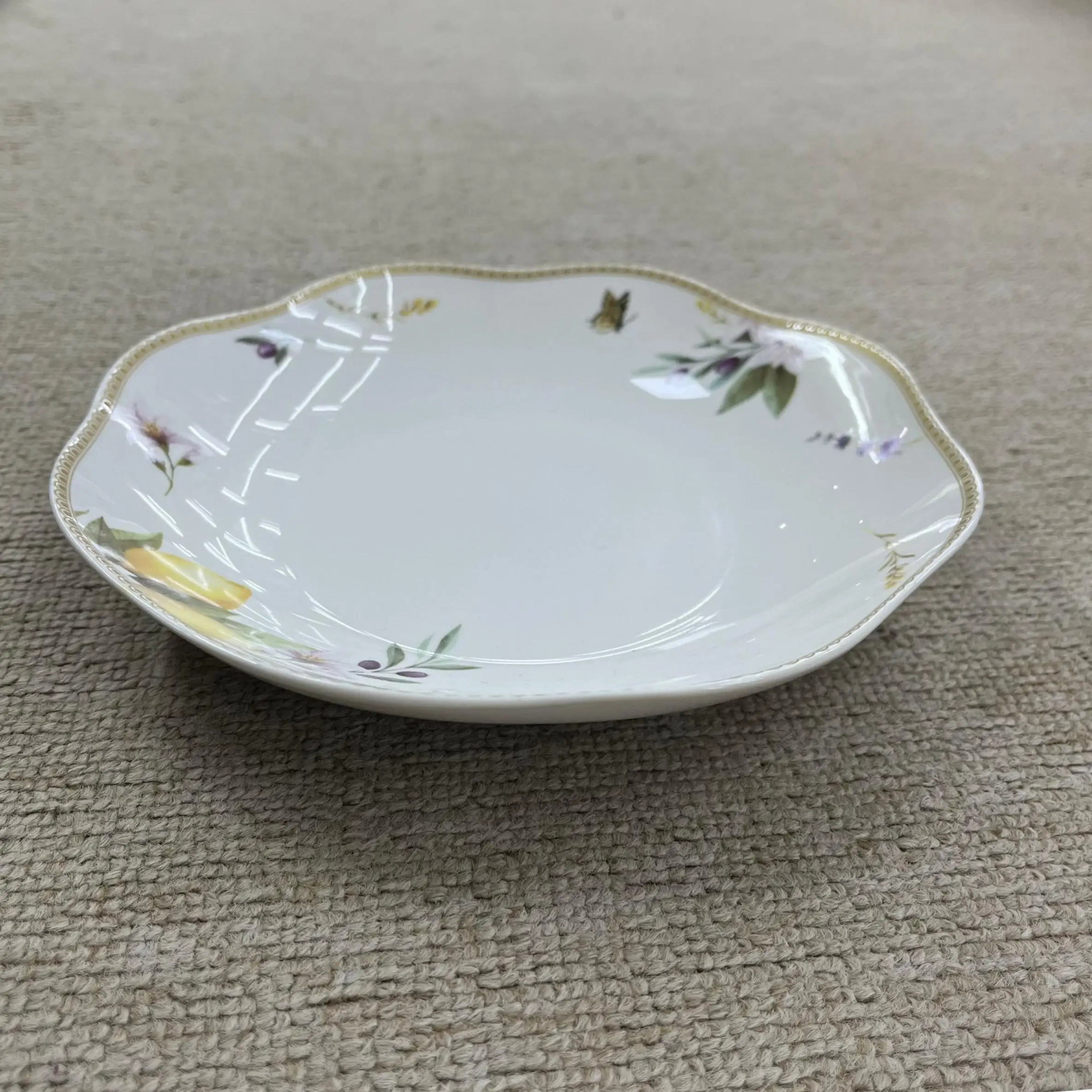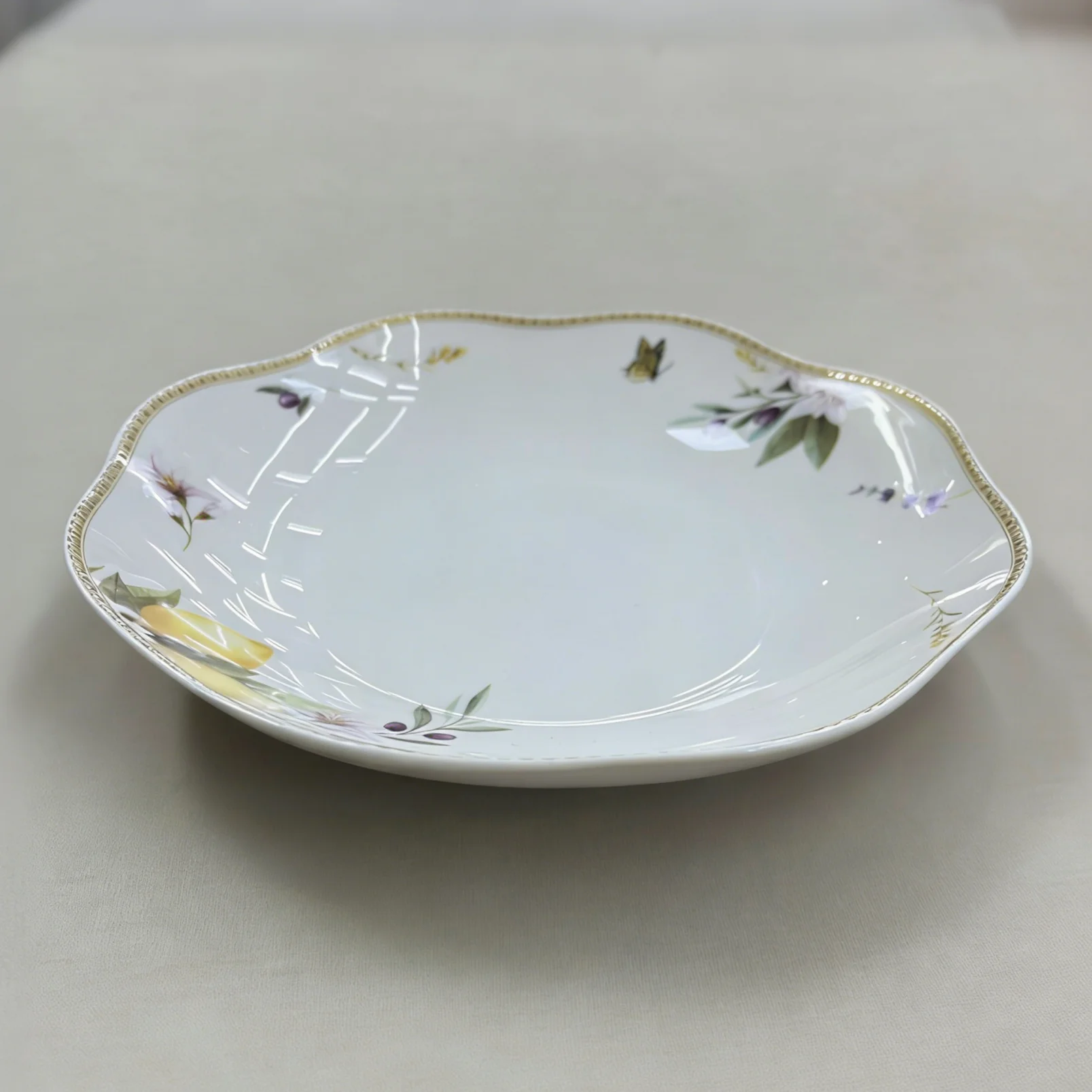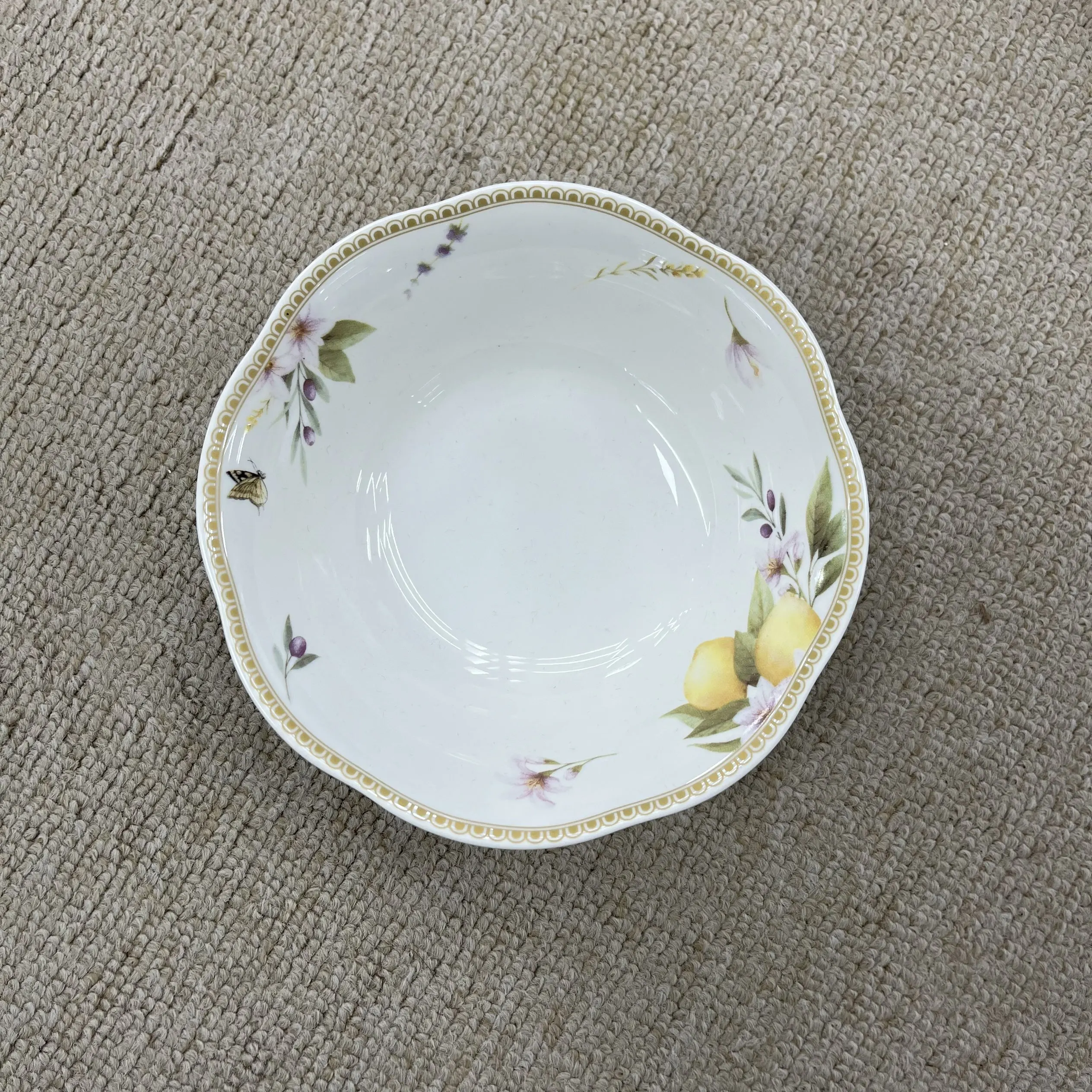 Κάθε λεία κεραμική πιάτο είναι διακοσμημένο με λεπτές, ανοιχτόχρωμες άνθη, μικρές πεταλούδες που φτερουγίζουν και λαμπερά, χαρούμενα στοιχεία λεμονιού—όλα τοποθετημένα μέσα σε ένα ζεστό, ρυζικό αγροτικό χάρισμα που νιώθει σαν μια αγκαλιά για το τραπέζι σας. Οι λεπτές φιμωτές άκρες και το παιχνιδιάρικο πιάτο με κίτρινες λωρίδες; Τέλεια επιλογή για να προσθέσετε μια αναπτερωτική απόχρωση χρώματος χωρίς να φαίνεται υπερβολικό.