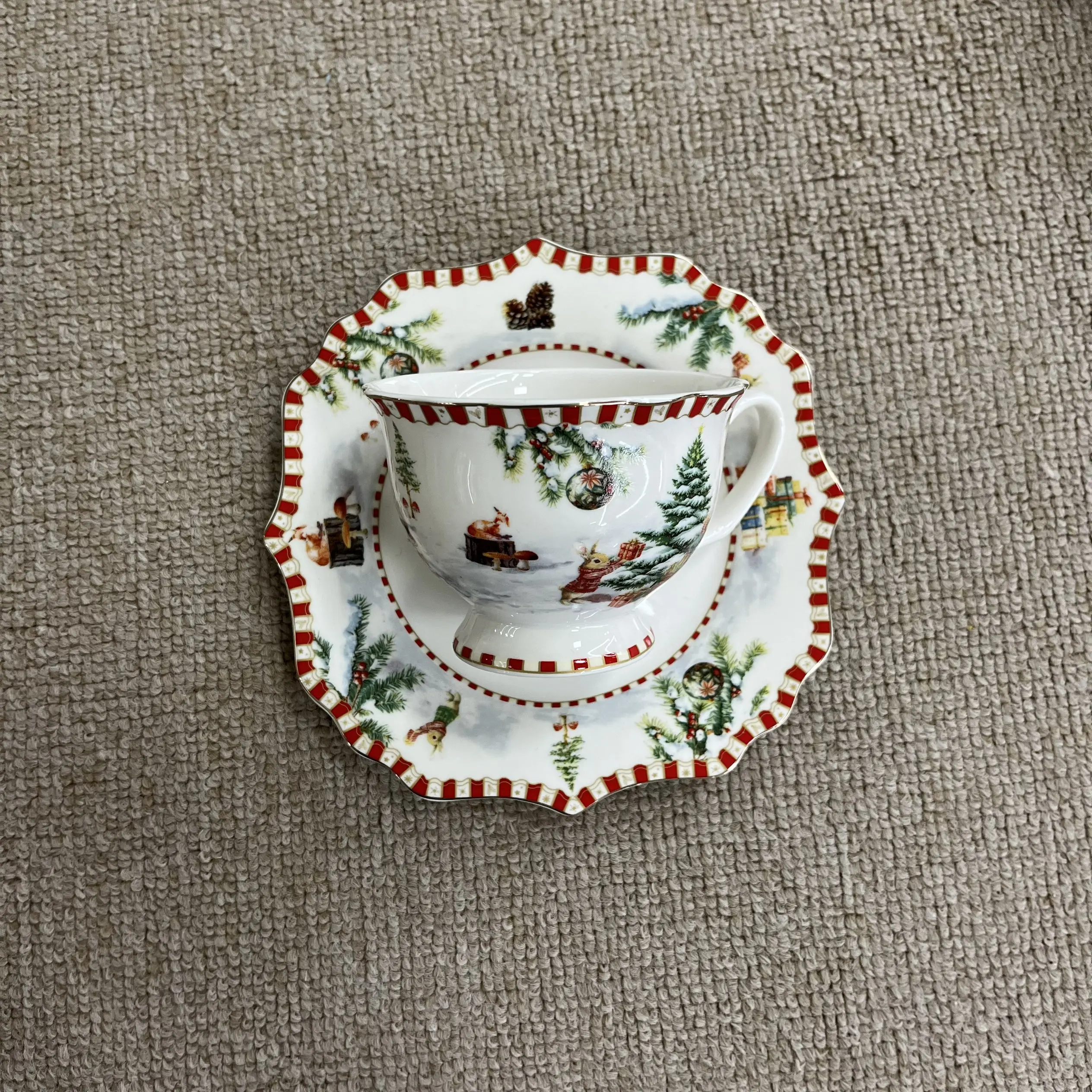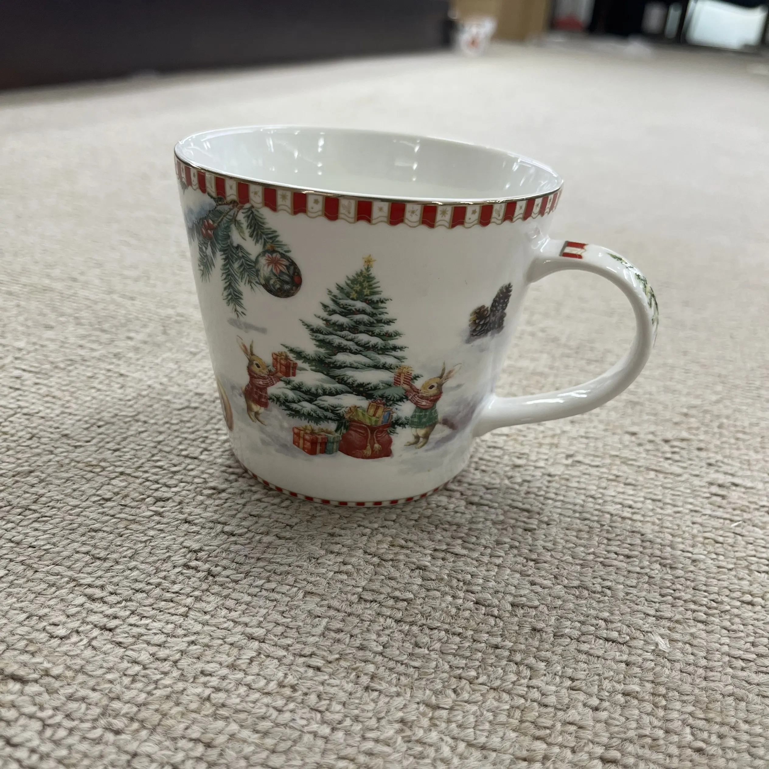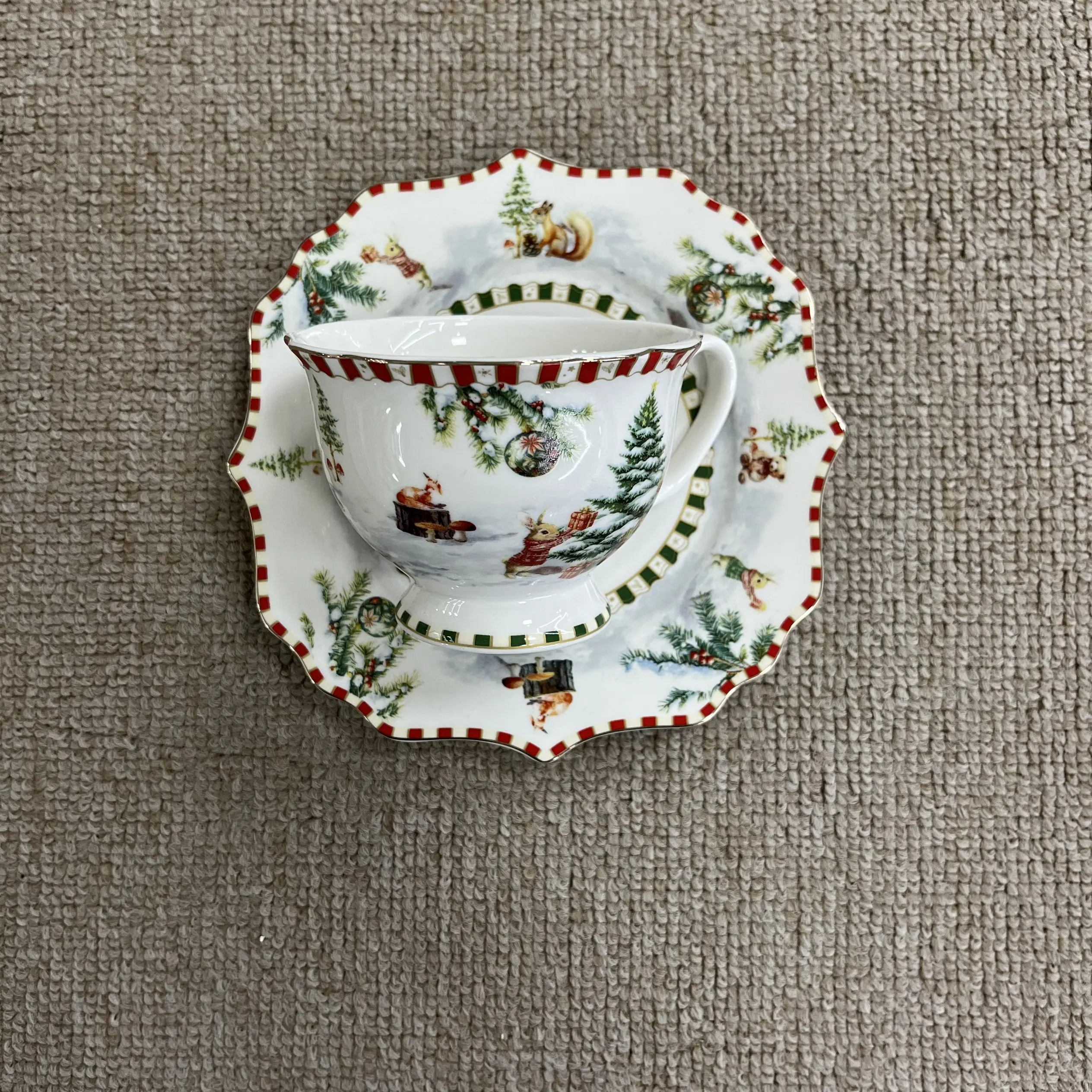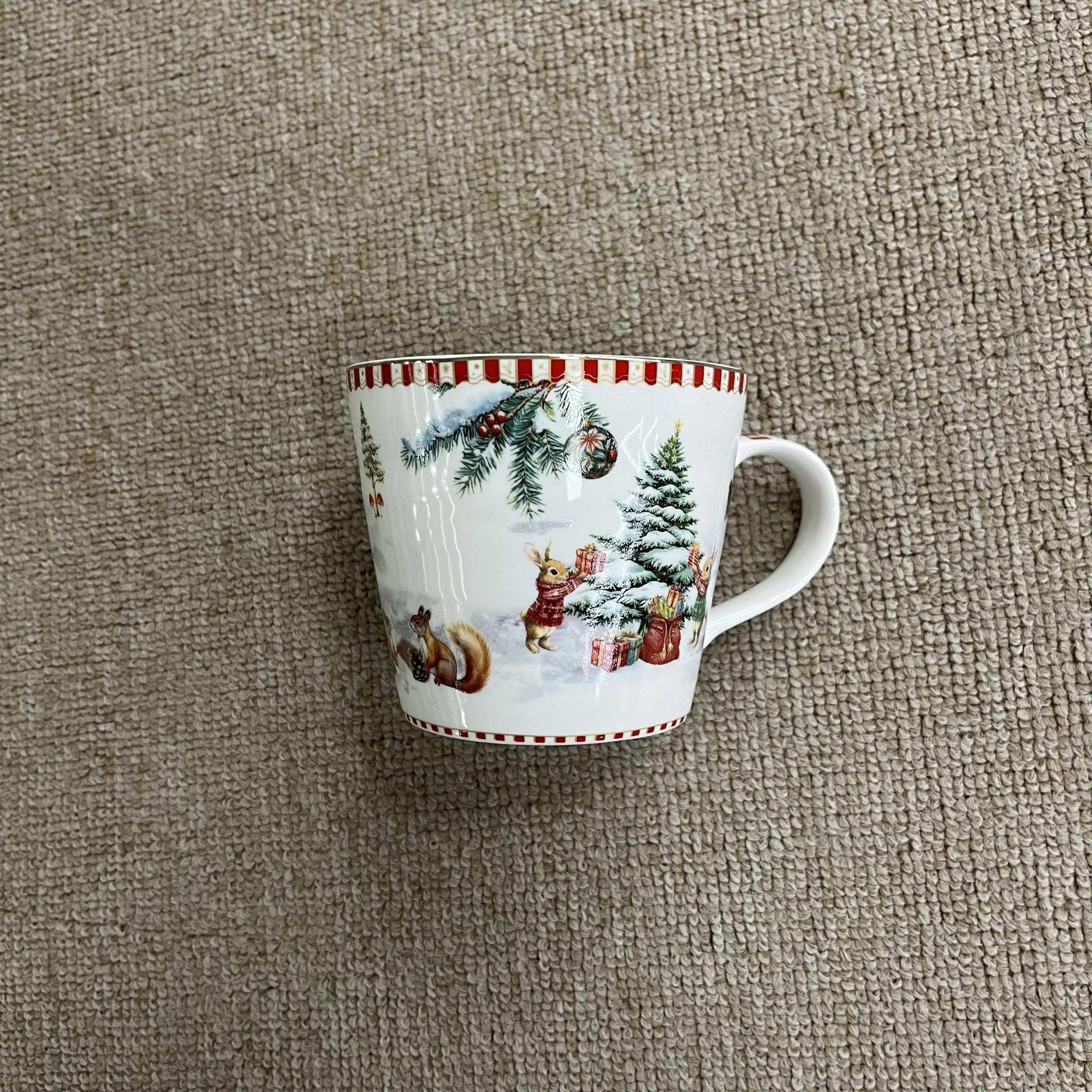 Κατασκευασμένο από λείο, γυαλιστερό πορσελάνη, το φλιτζάνι παρουσιάζει μια γιορτινή σκηνή γεμάτη θέρμη: ένα μαλακό κουνέλι (ντυμένο με κόκκινο σακάκι) παραδίδει δώρα δίπλα σε ένα χριστουγεννιάτικο δέντρο λευκισμένο από το χιόνι, ενώ ένα χαριτωμένο σκιουράκι κρατά ένα κουκουνάρι κοντά. Πλούσια διακριτικά σκουληκιά (που φέρουν ένα λαμπερό χριστουγεννιάτικο διακοσμητικό) περιβάλλουν το σχέδιο, ενώ το χείλος και η βάση του φλιτζανιού φέρουν καθαρές κόκκινες και λευκές ρίγες, που συνδέονται με τις κλασικές χριστουγεννιάτικες αποχρώσεις.