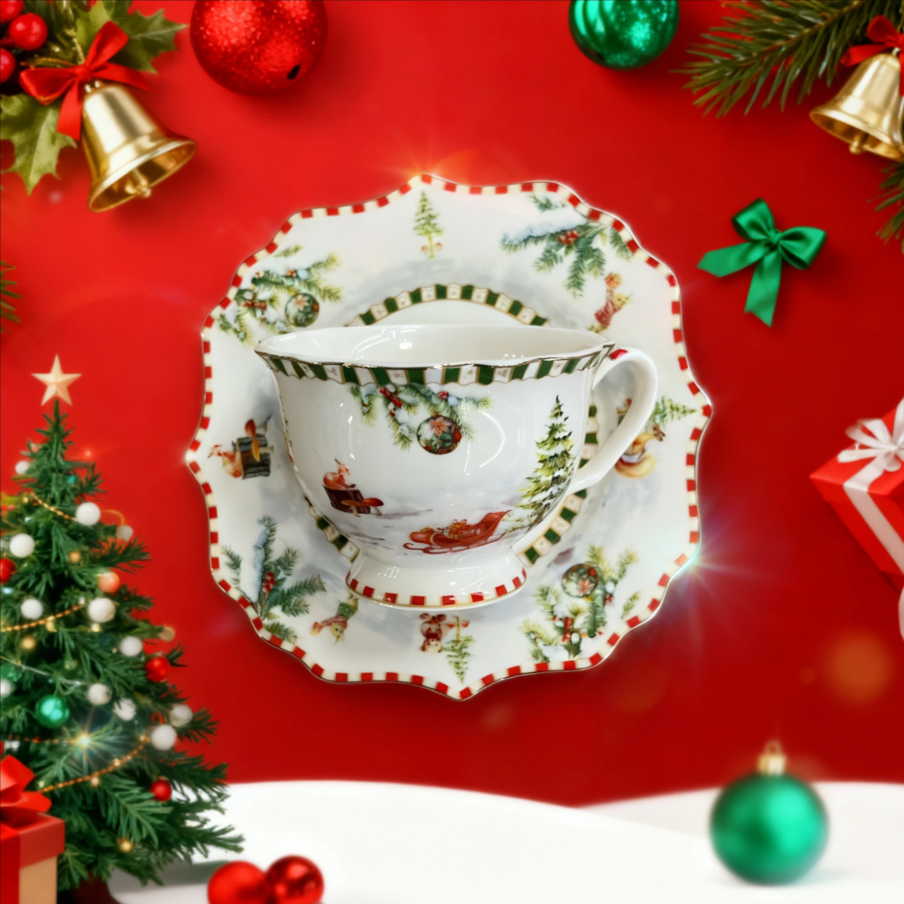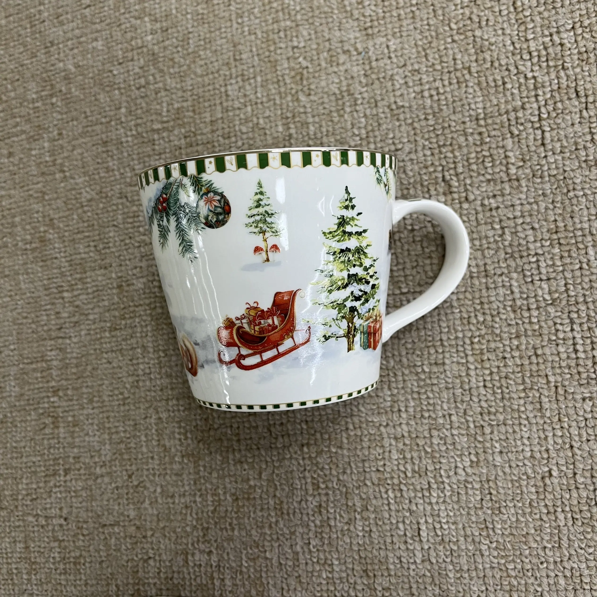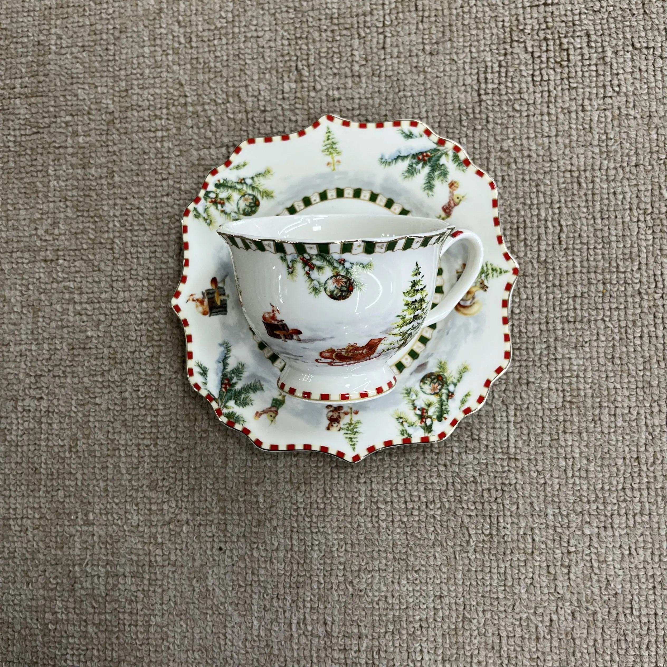 Κατασκευασμένο από λείο, γυαλιστερό πορσελάνη, το φλιτζάνι παρουσιάζει μια γιορτινή σκηνή γεμάτη θέρμη: ένα μαλακό κουνέλι (ντυμένο με κόκκινο σακάκι) παραδίδει δώρα δίπλα σε ένα χριστουγεννιάτικο δέντρο λευκισμένο από το χιόνι, ενώ ένα χαριτωμένο σκιουράκι κρατά ένα κουκουνάρι κοντά. Πλούσια διακριτικά σκουληκιά (που φέρουν ένα λαμπερό χριστουγεννιάτικο διακοσμητικό) περιβάλλουν το σχέδιο, ενώ το χείλος και η βάση του φλιτζανιού φέρουν καθαρές κόκκινες και λευκές ρίγες, που συνδέονται με τις κλασικές χριστουγεννιάτικες αποχρώσεις.