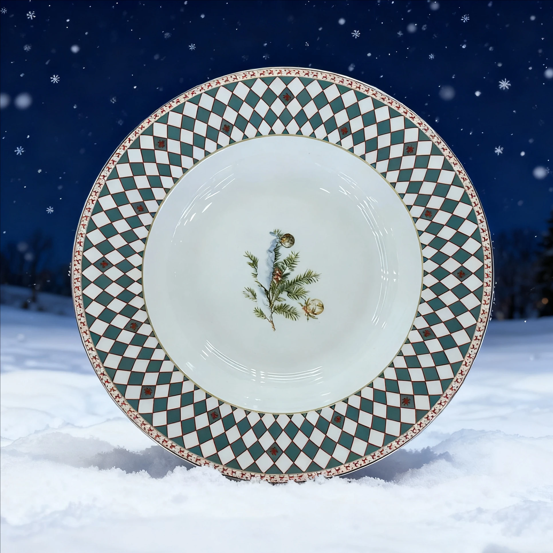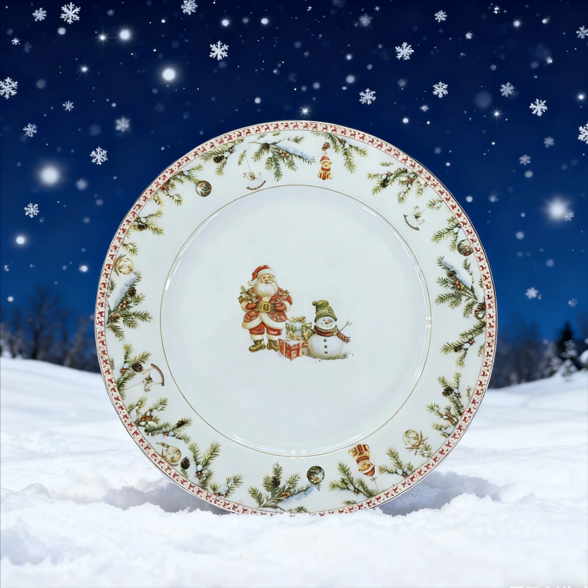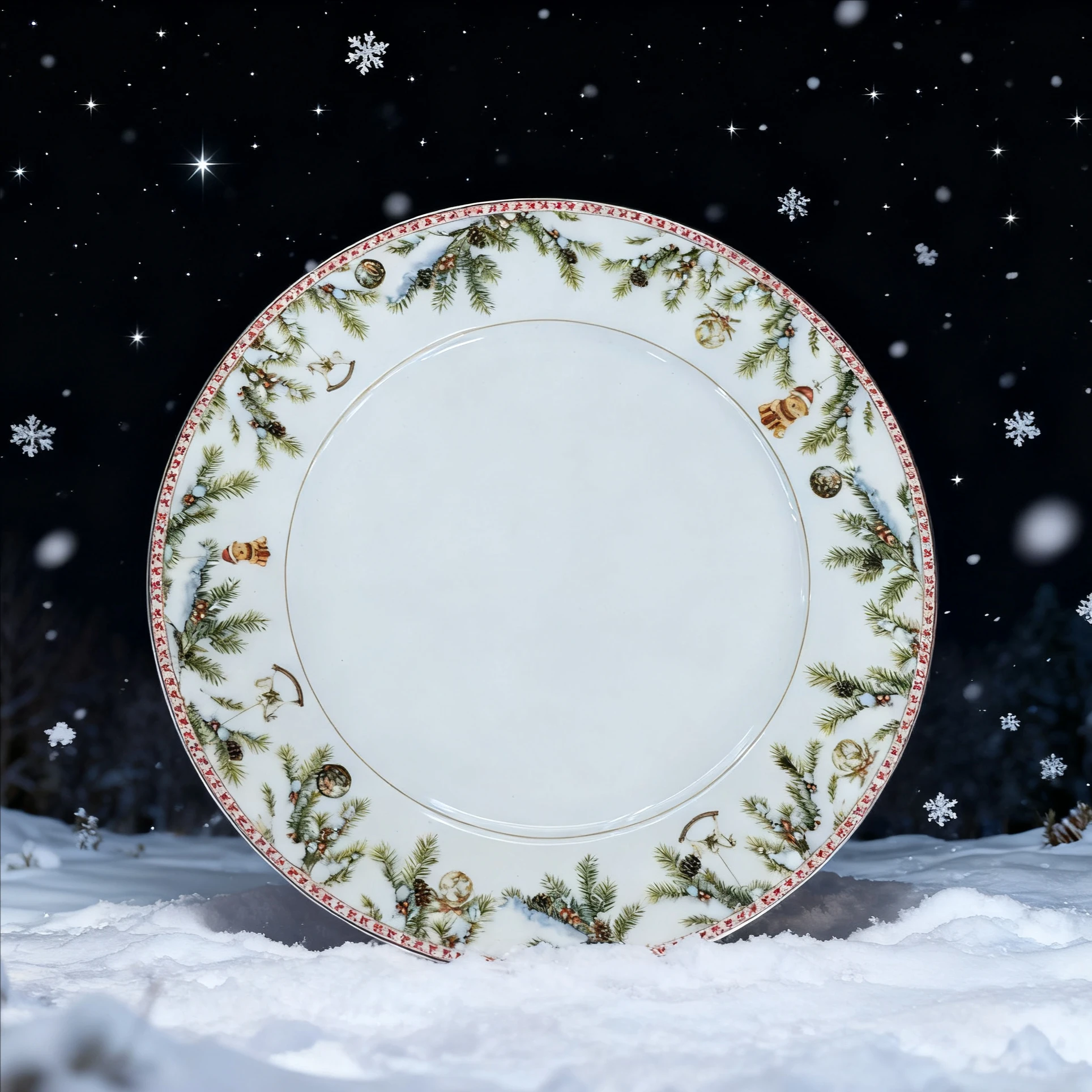 οι άκρες είναι διακοσμημένες με πλούσιες βελανιδιές, λαμπερά χριστουγεννιάτικα στολίδια και αγριώτικα κουκουνάρια, φέρνοντας τη θερμασία μιας δάσους με πεύκα που έχει καλυφθεί από χιόνι. Ξεχωριστές λεπτομέρειες περιλαμβάνουν γλυκιές κεντρικές εικόνες (όπως ένας χαρούμενος Άγιος Βασίλης δίπλα σε έναν παχύ άνθρακα χιονιού) σε επιλεγμένα πιάτα, καθώς και ένα ξεκάθαρο τετραγωνισμένο περίγραμμα (σε κόκκινο και πράσινο) σε ένα πιάτο, προσθέτοντας οπτικό κείμενο και γιορτινή λάμψη.