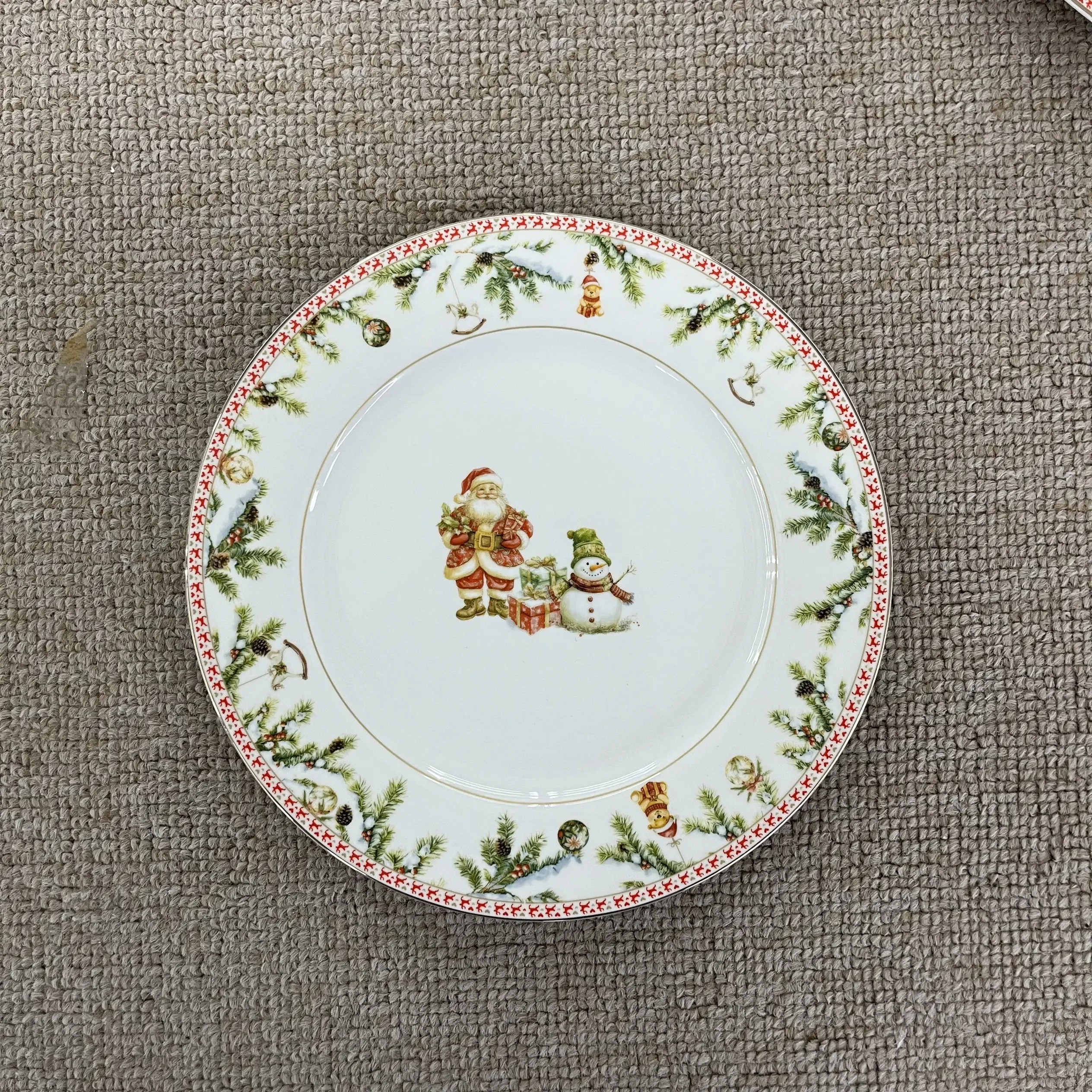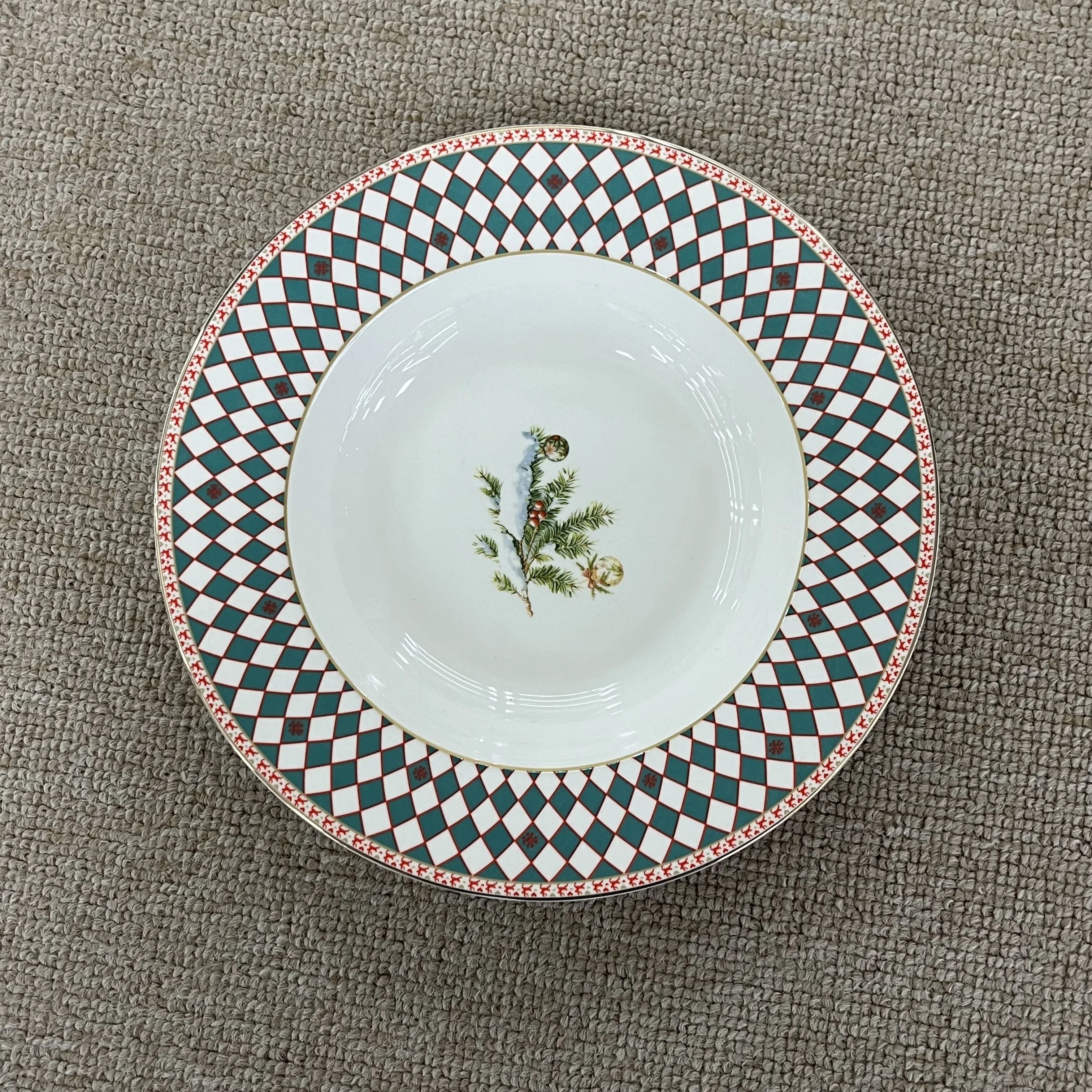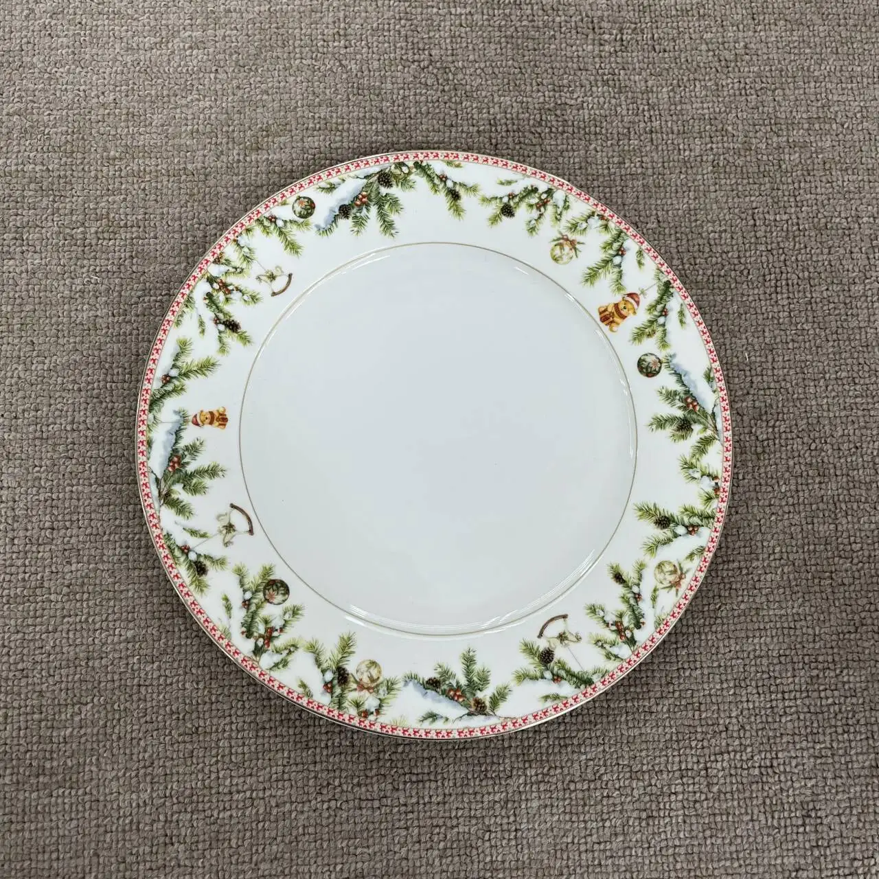 οι άκρες είναι διακοσμημένες με πλούσιες βελανιδιές, λαμπερά χριστουγεννιάτικα στολίδια και αγριώτικα κουκουνάρια, φέρνοντας τη θερμασία μιας δάσους με πεύκα που έχει καλυφθεί από χιόνι. Ξεχωριστές λεπτομέρειες περιλαμβάνουν γλυκιές κεντρικές εικόνες (όπως ένας χαρούμενος Άγιος Βασίλης δίπλα σε έναν παχύ άνθρακα χιονιού) σε επιλεγμένα πιάτα, καθώς και ένα ξεκάθαρο τετραγωνισμένο περίγραμμα (σε κόκκινο και πράσινο) σε ένα πιάτο, προσθέτοντας οπτικό κείμενο και γιορτινή λάμψη.
