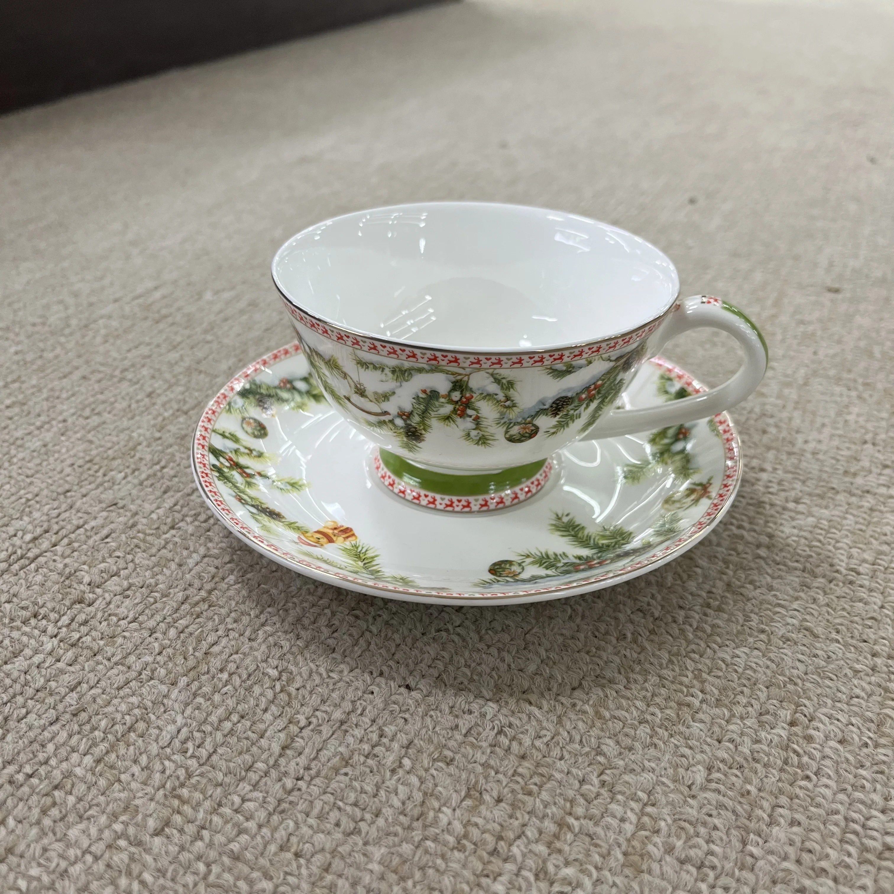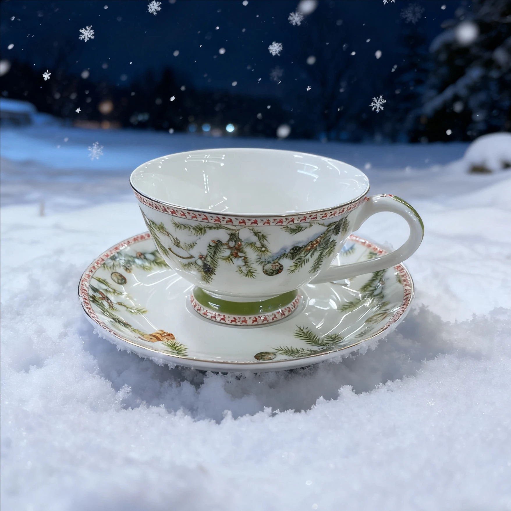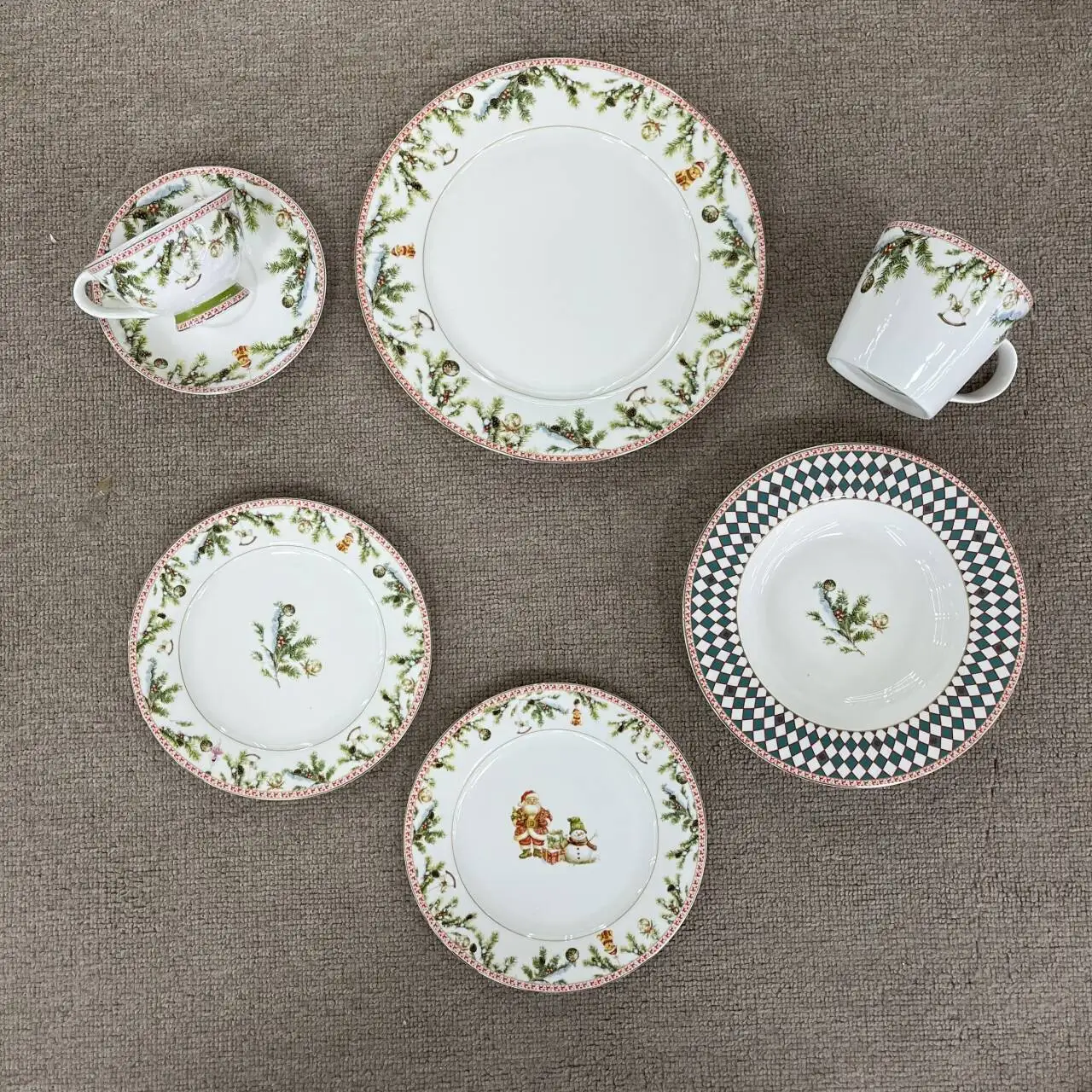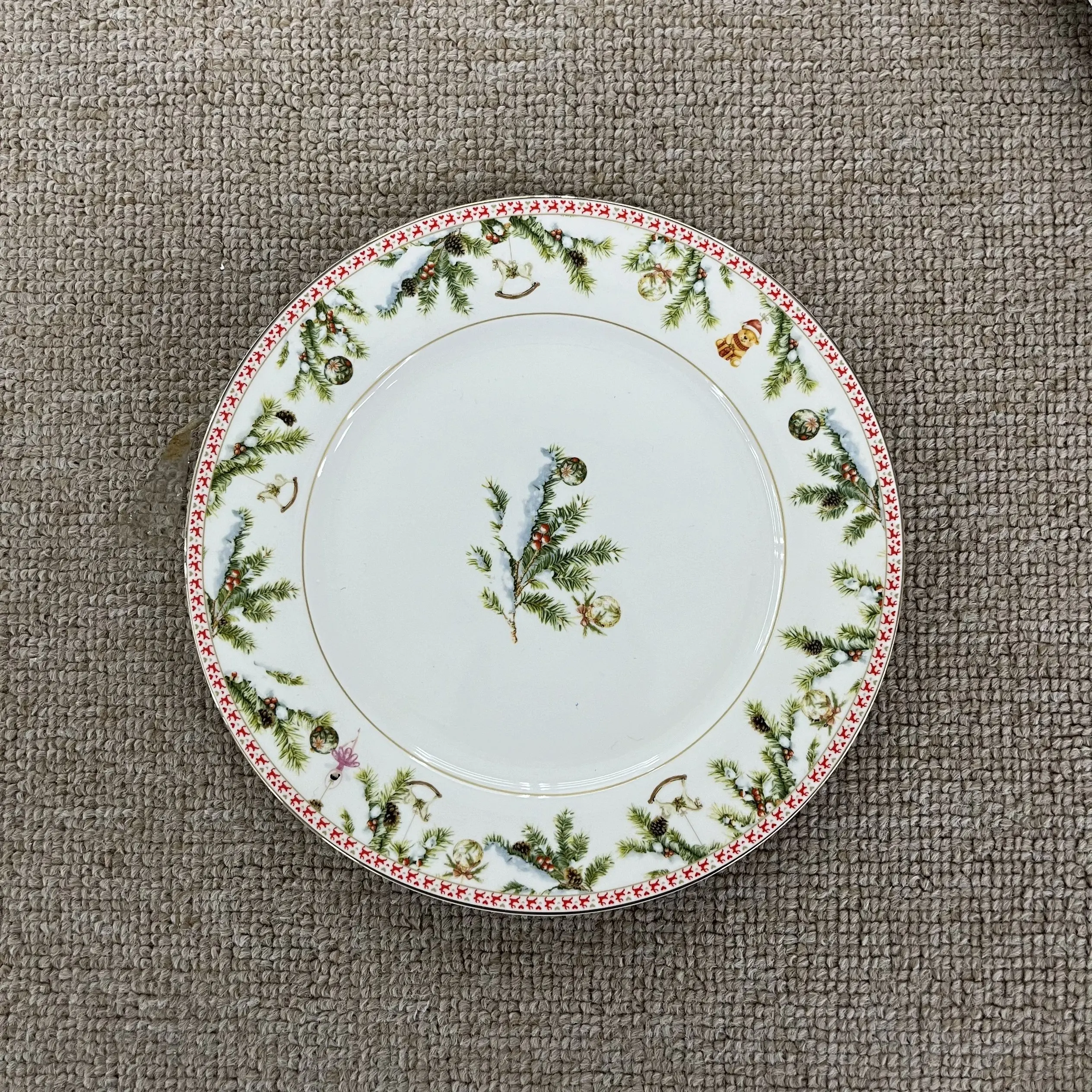 Κατασκευασμένο από λείο, ανθεκτικό πορσελάνη, κάθε κομμάτι αποπνέει την κλασική ατμόσφαιρα των γιορτών: οι άκρες είναι διακοσμημένες με πλούσιες βελανιδιές, λαμπερά χριστουγεννιάτικα στολίδια και αγριώτικα κουκουνάρια, φέρνοντας τη θερμασία μιας δάσους με πεύκα που έχει καλυφθεί από χιόνι. Ξεχωριστές λεπτομέρειες περιλαμβάνουν γλυκιές κεντρικές εικόνες (όπως ένας χαρούμενος Άγιος Βασίλης δίπλα σε έναν παχύ άνθρακα χιονιού) σε επιλεγμένα πιάτα, καθώς και ένα ξεκάθαρο τετραγωνισμένο περίγραμμα (σε κόκκινο και πράσινο) σε ένα πιάτο, προσθέτοντας οπτικό κείμενο και γιορτινή λάμψη.