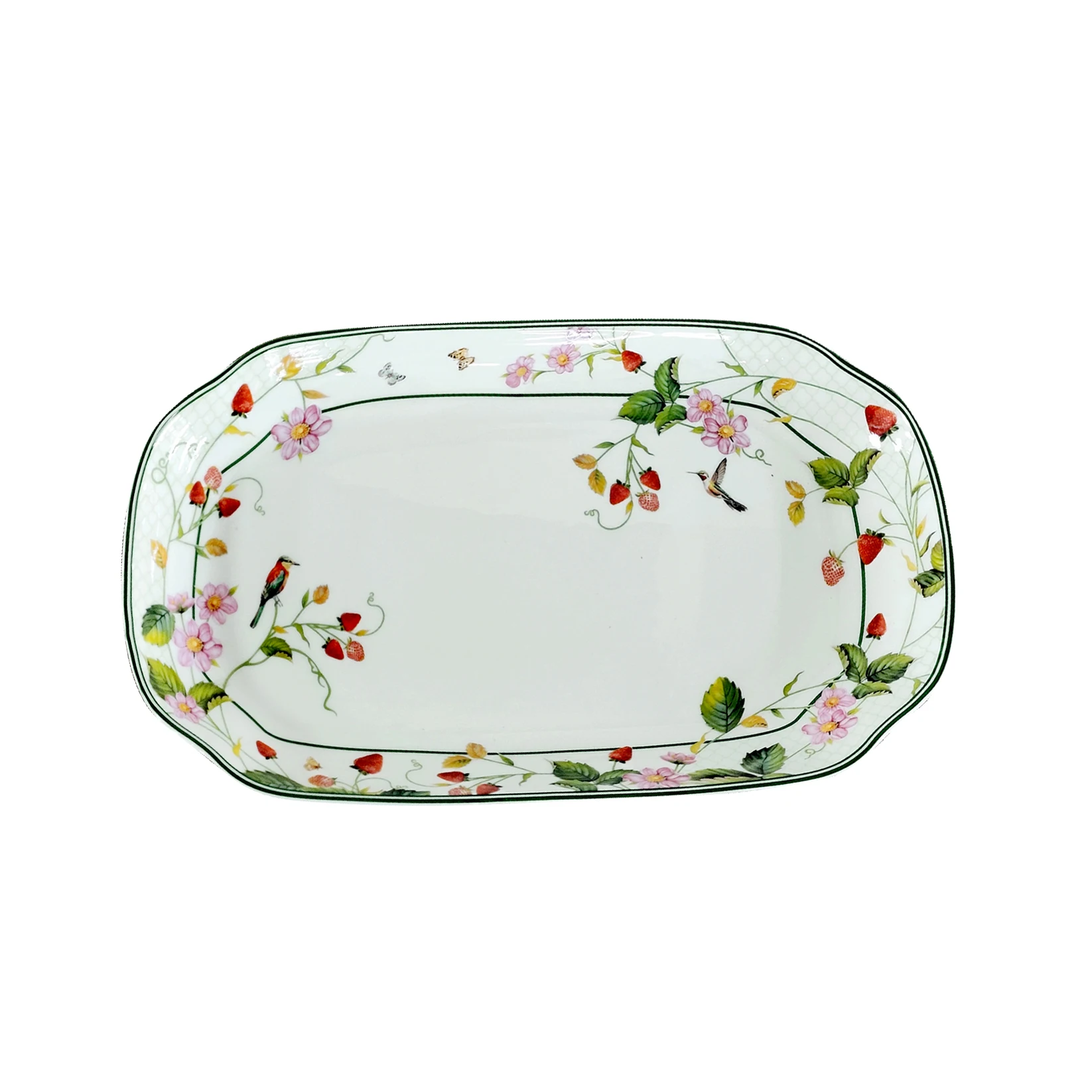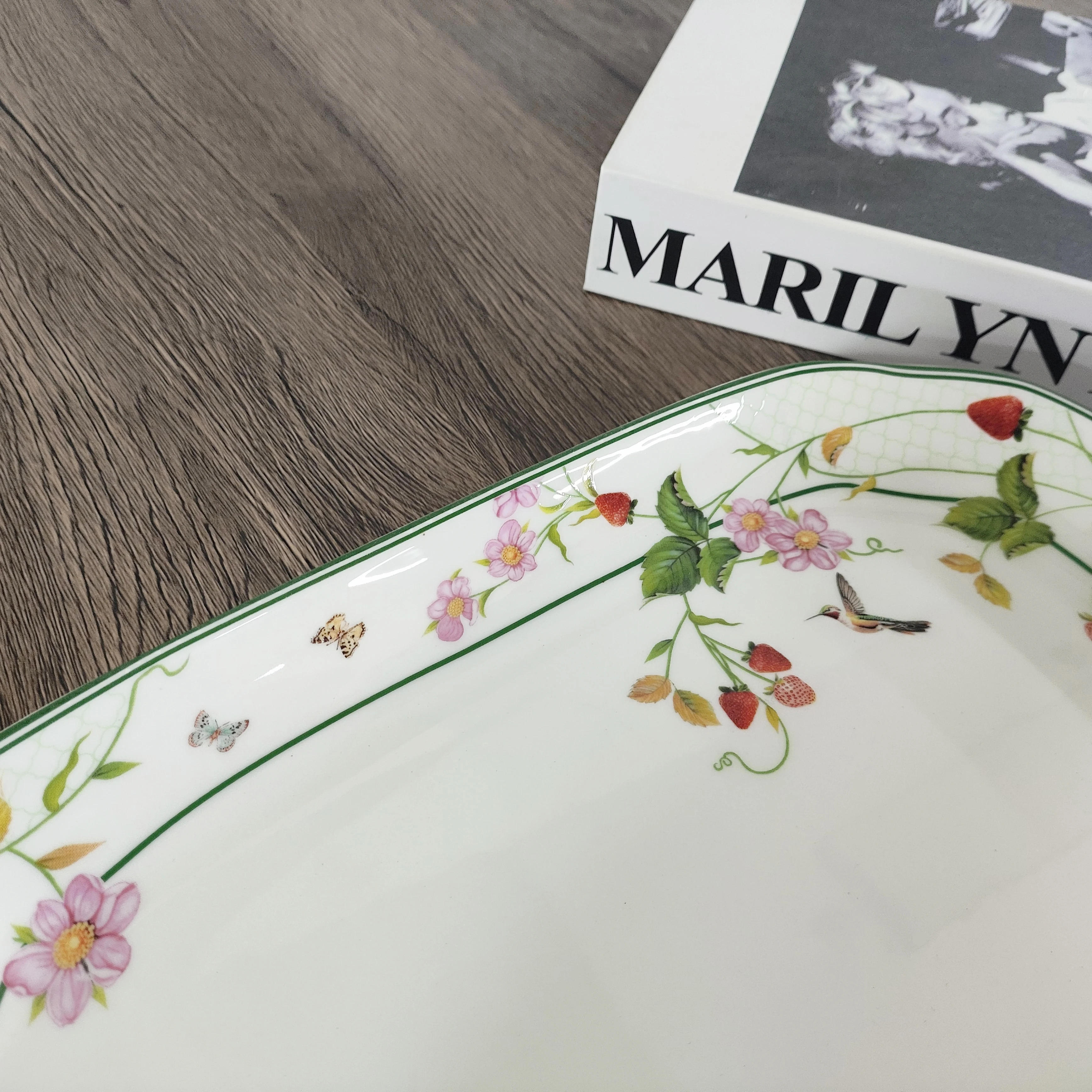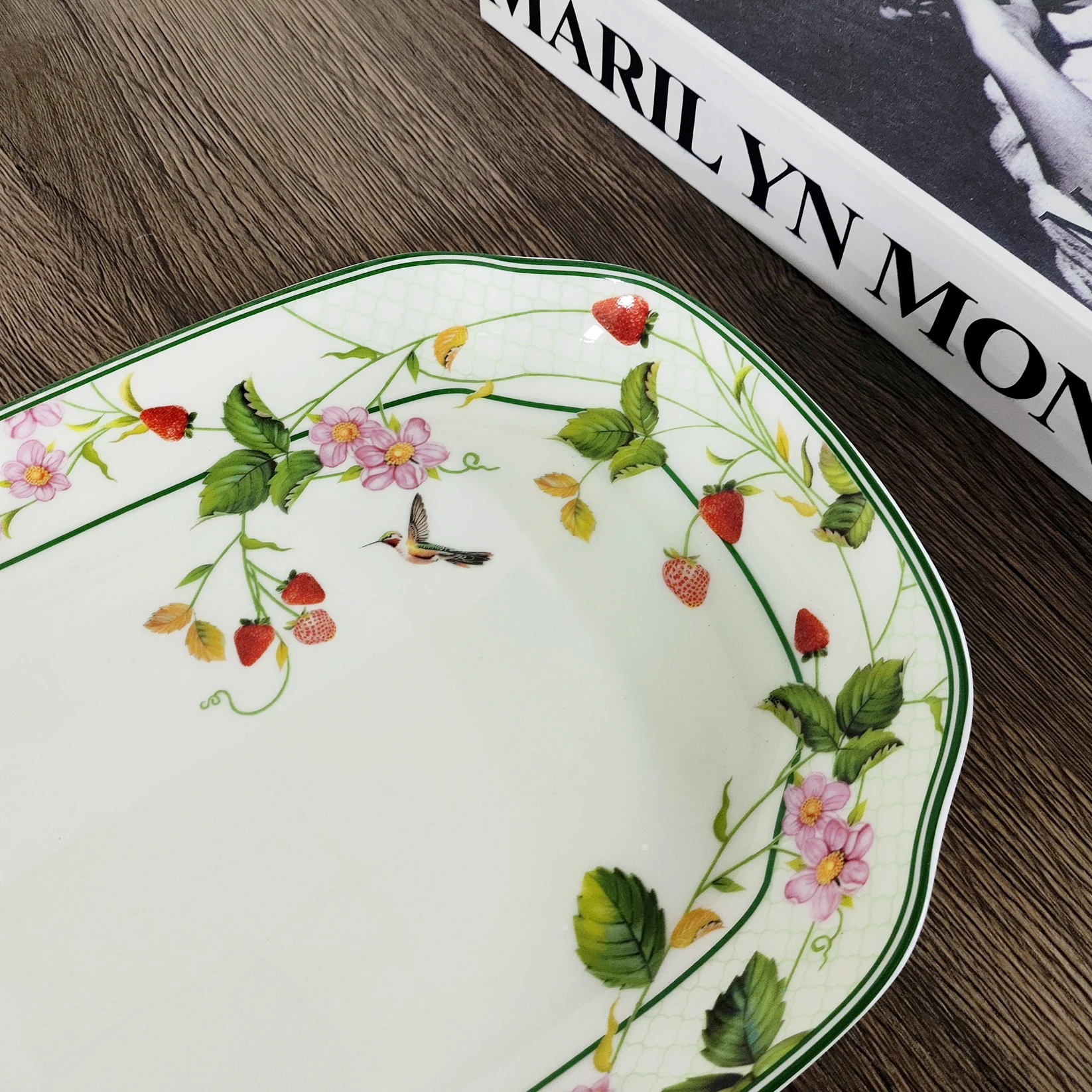 Κοιτάξτε τις ζωντανές, παιχνιδιάρικες λεπτομέρειες: πλημμυρικά κόκκινα φράουλες, απαλά ροζ άνθη, γελαστά πουλάκια, ένας αιωρούμενος γκότσος και πεταλούδες που φλερτάρουν — όλα μαζί με ένα φρέσκο πράσινο περίχαρμα που σας μεταφέρει στην αναπνοή του καλοκαιριού. Είναι το είδος δίσκου που μεταμορφώνει μια στοίβα μπισκότων, ένα μπολ με φρέσκα βερίκοκα ή ένα πλούσιο πρωινό σε μια χαρούμενη, πικ-νικ σκηνή