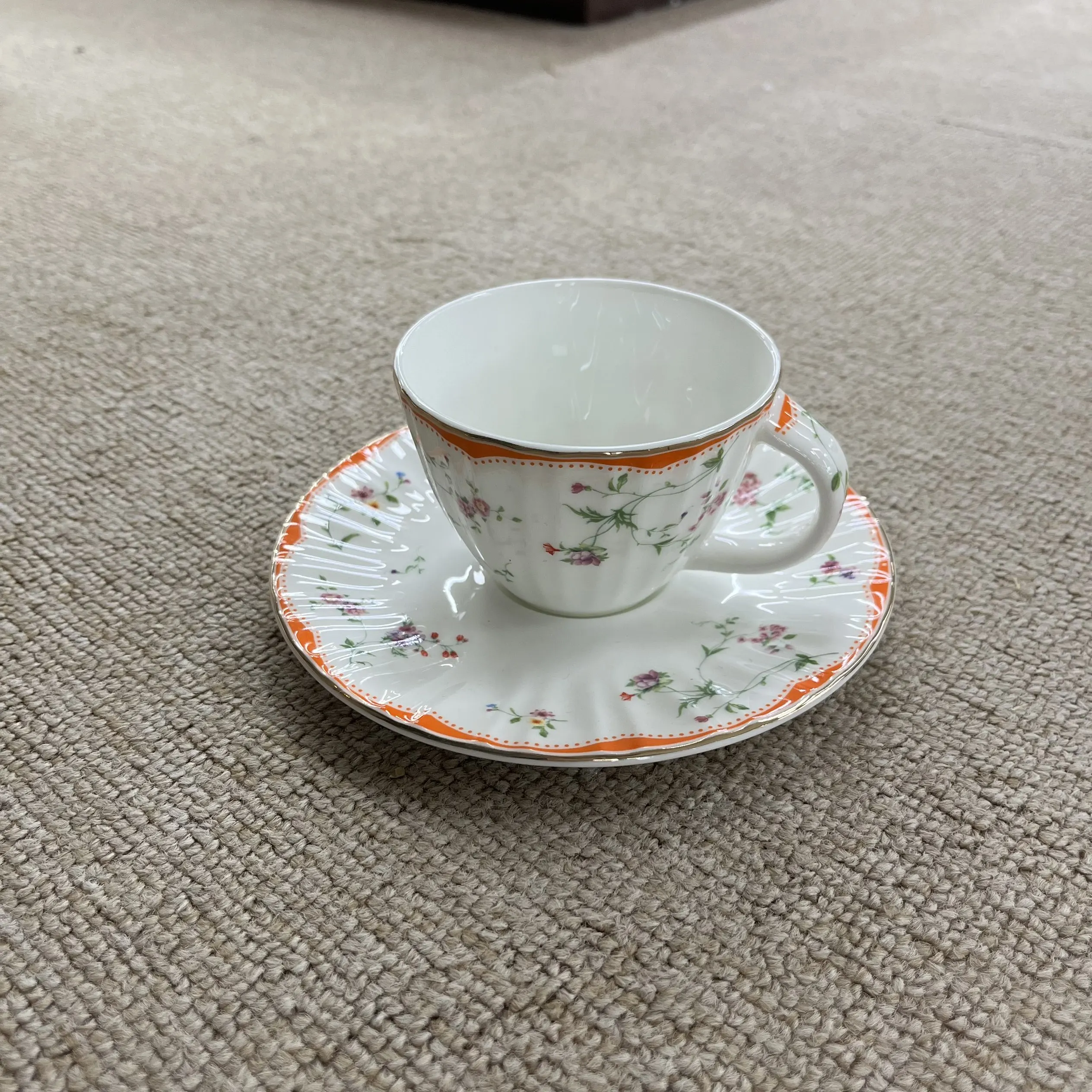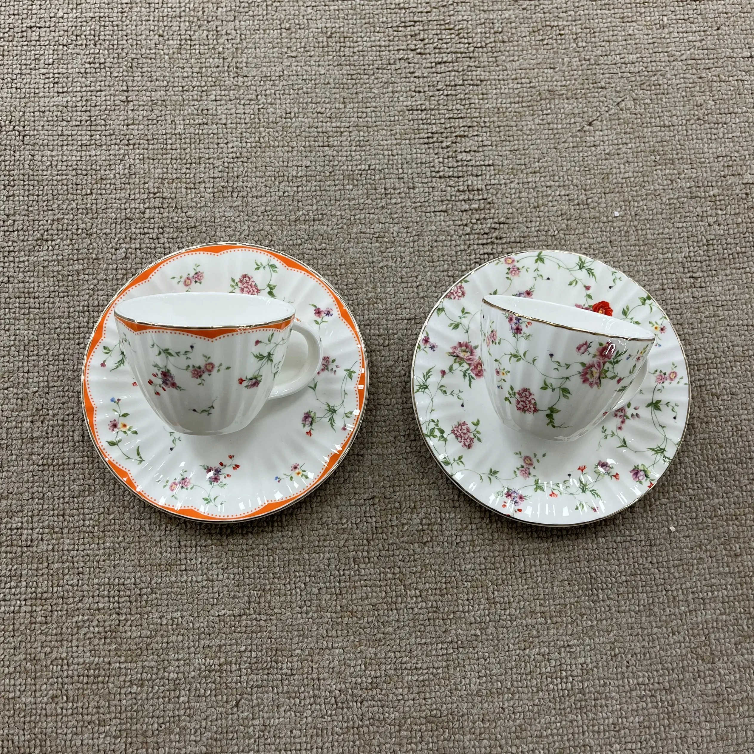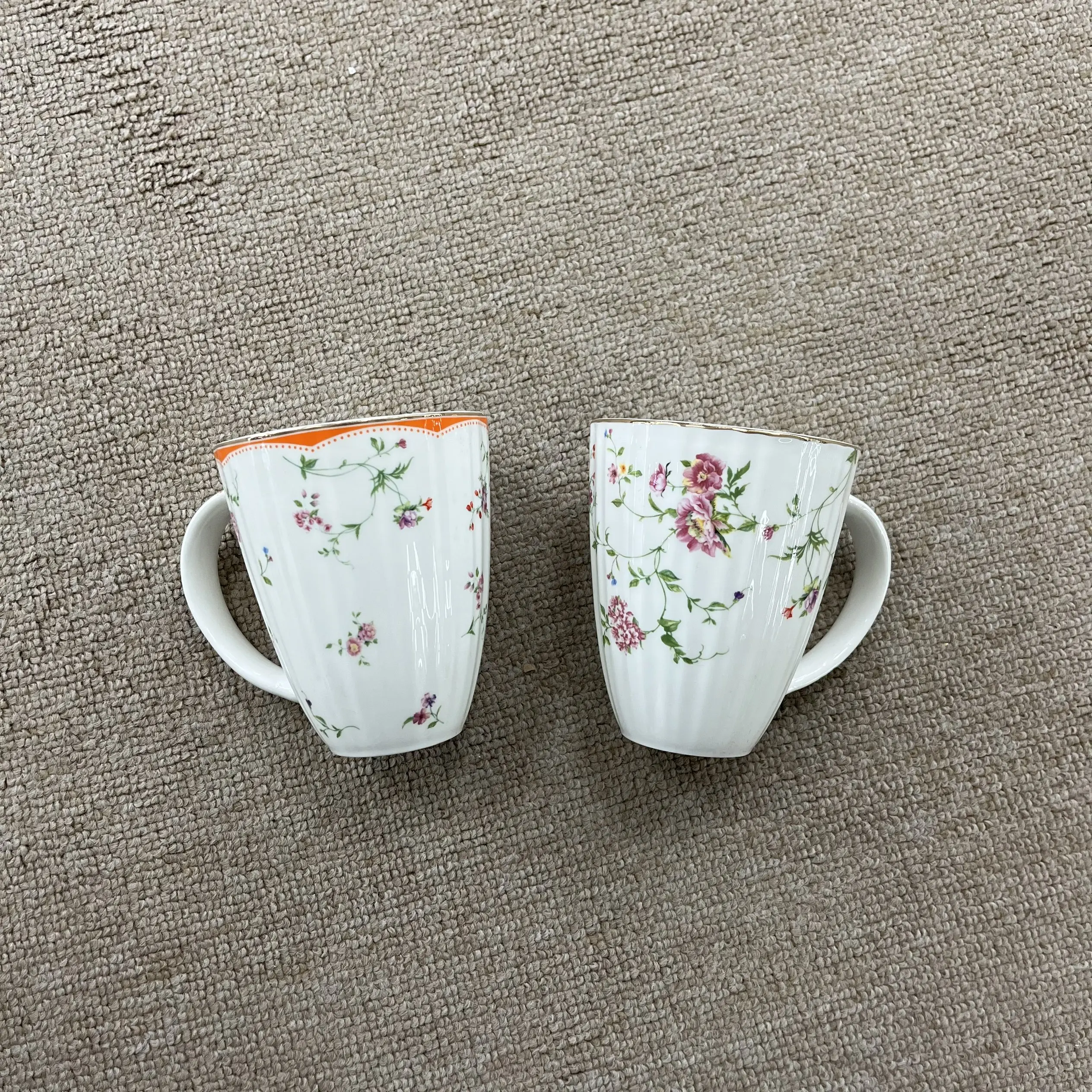 Κάθε φλιτζάνι έχει μαλακή, αυλωτή επιφάνεια από κεραμικό (τόσο ευχάριστη στην αφή!) που περιβάλλεται από λεπτές, ανθούς με βιντεοζώντα στυλ: το ένα φέρει ψιλές, μικρές άνθισεις, ενώ το άλλο διακρίνεται για πλουσιότερες, πιο γεμάτες ομάδες ανθών—με ένα παιχνιδιάρικο πορτοκαλί περίγυρο στο ένα, που προσθέτει μια λαμπερή, χαρούμενη πινελιά.
