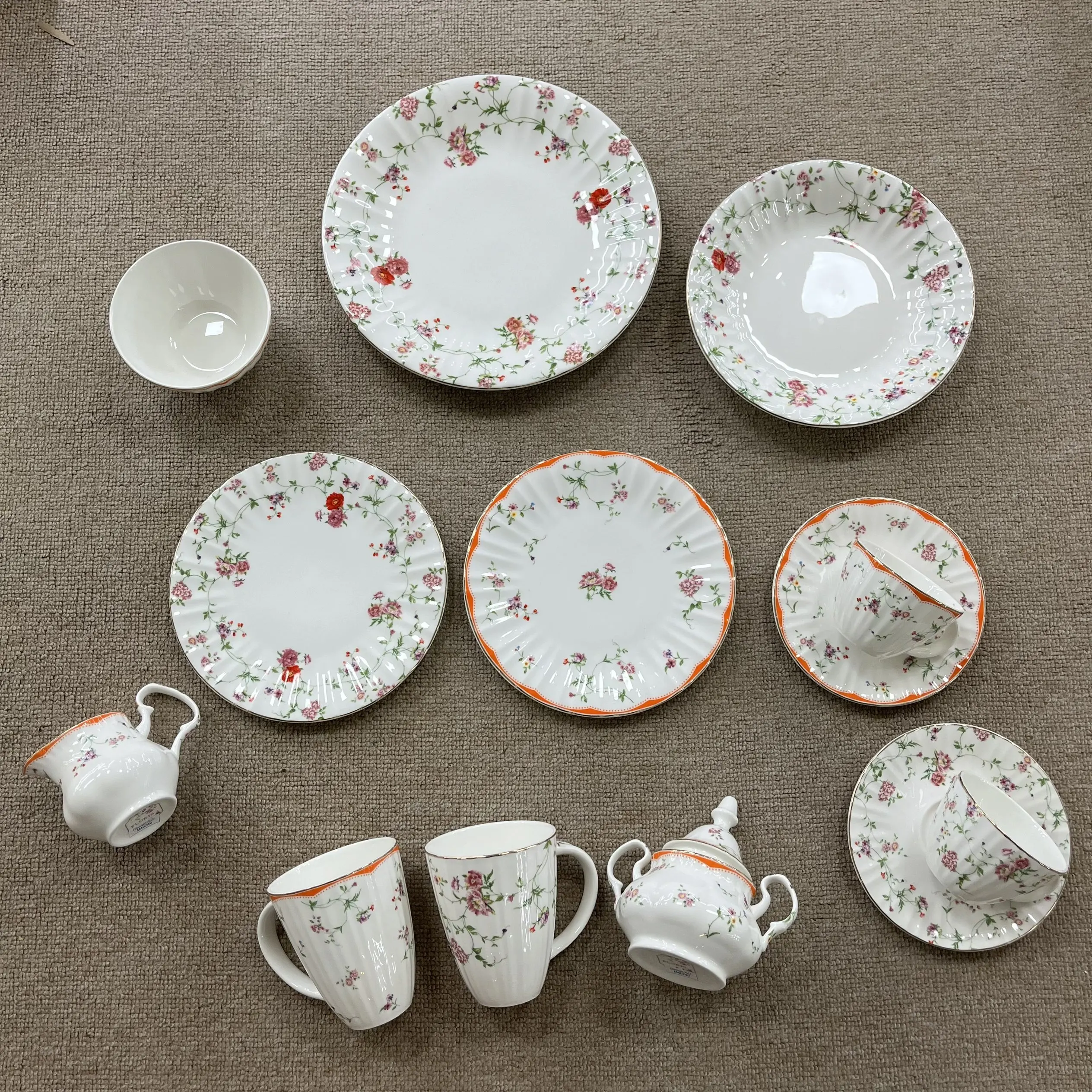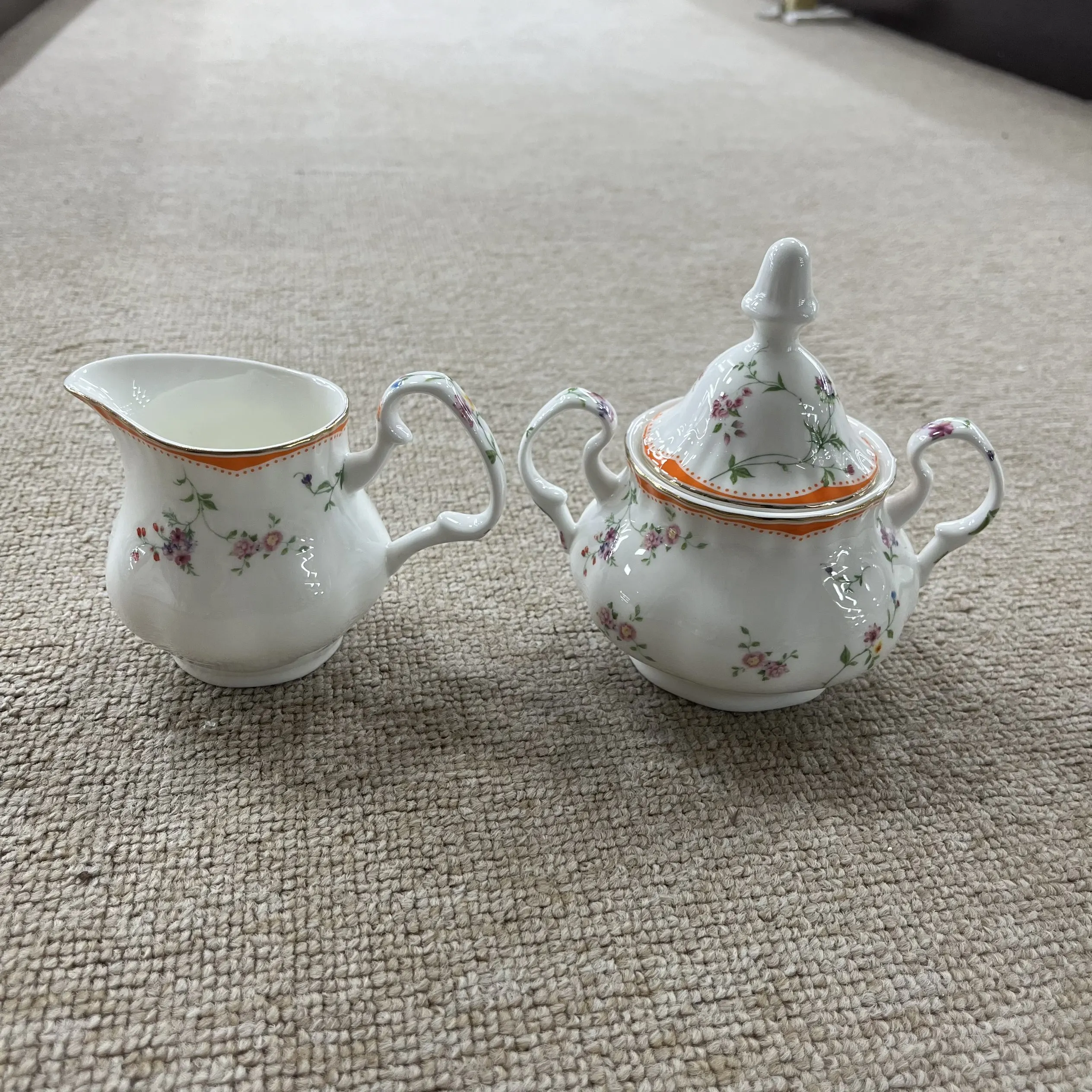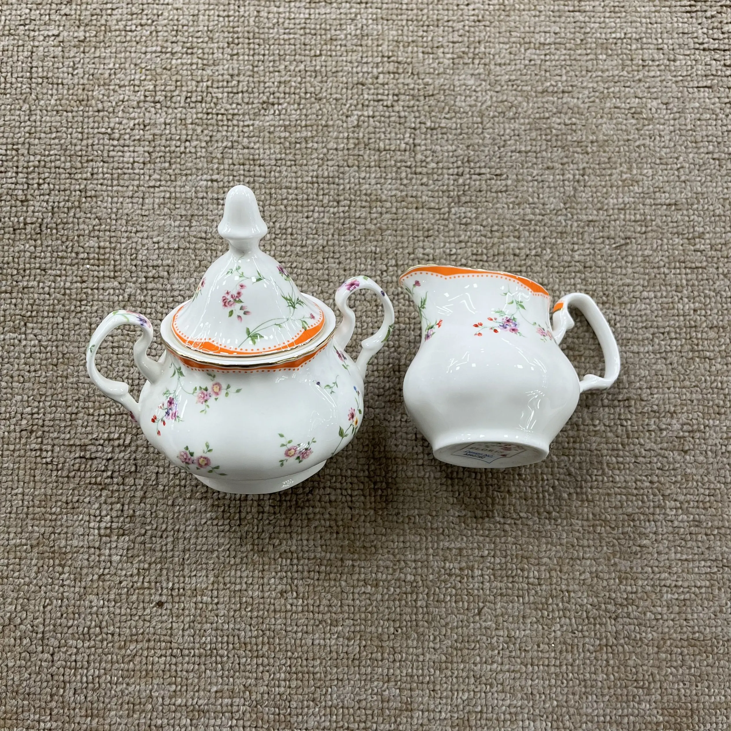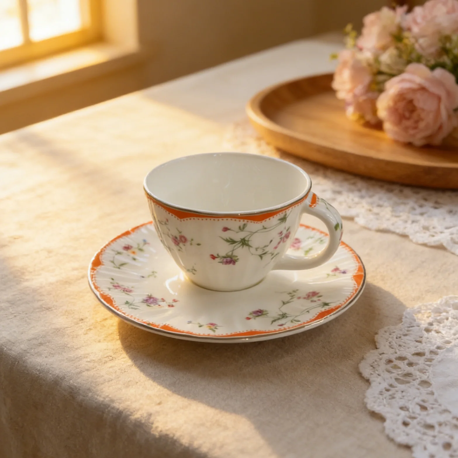 Κάθε φλιτζάνι έχει μαλακή, αυλωτή επιφάνεια από κεραμικό (τόσο ευχάριστη στην αφή!) που περιβάλλεται από λεπτές, ανθούς με βιντεοζώντα στυλ: το ένα φέρει ψιλές, μικρές άνθισεις, ενώ το άλλο διακρίνεται για πλουσιότερες, πιο γεμάτες ομάδες ανθών—με ένα παιχνιδιάρικο πορτοκαλί περίγυρο στο ένα, που προσθέτει μια λαμπερή, χαρούμενη πινελιά.