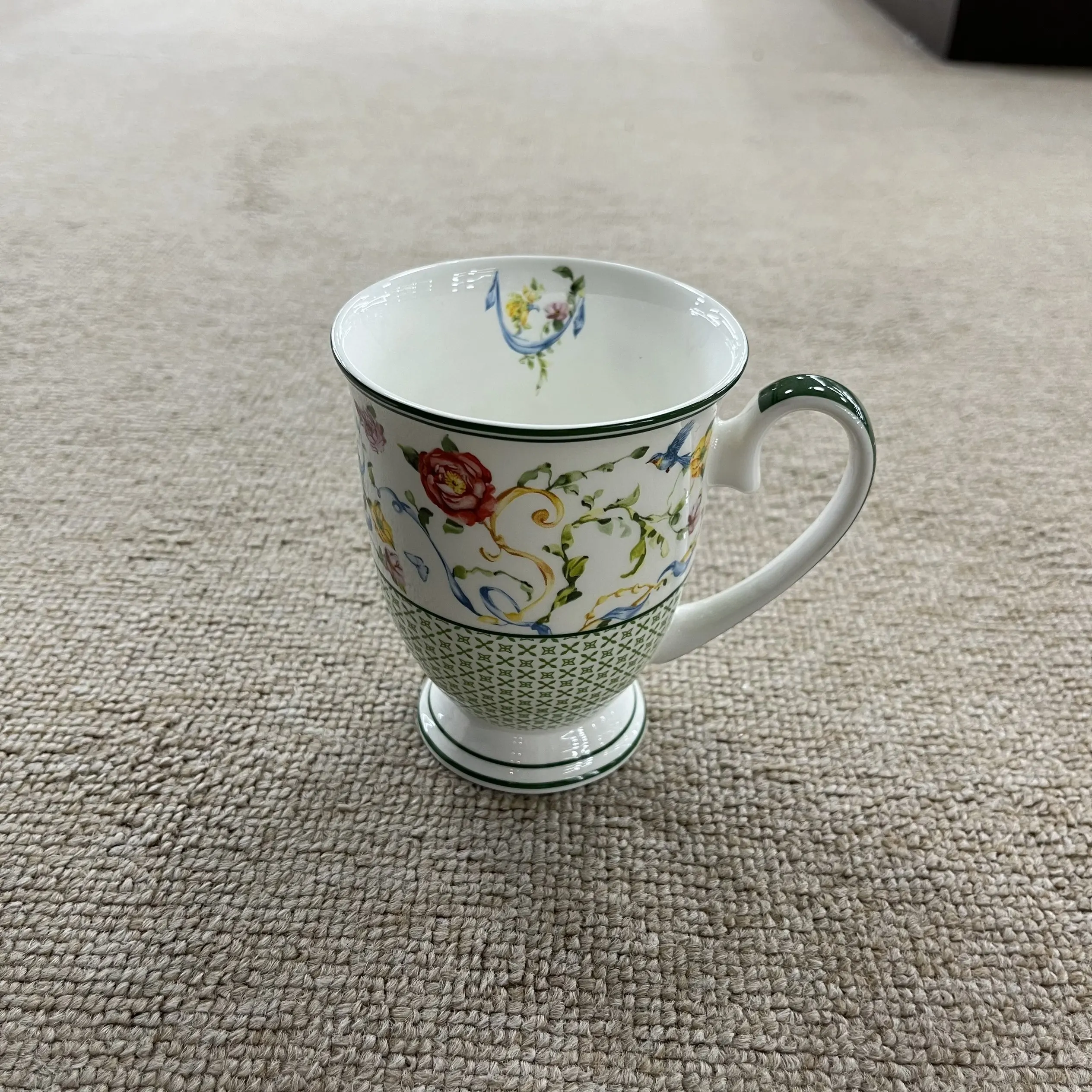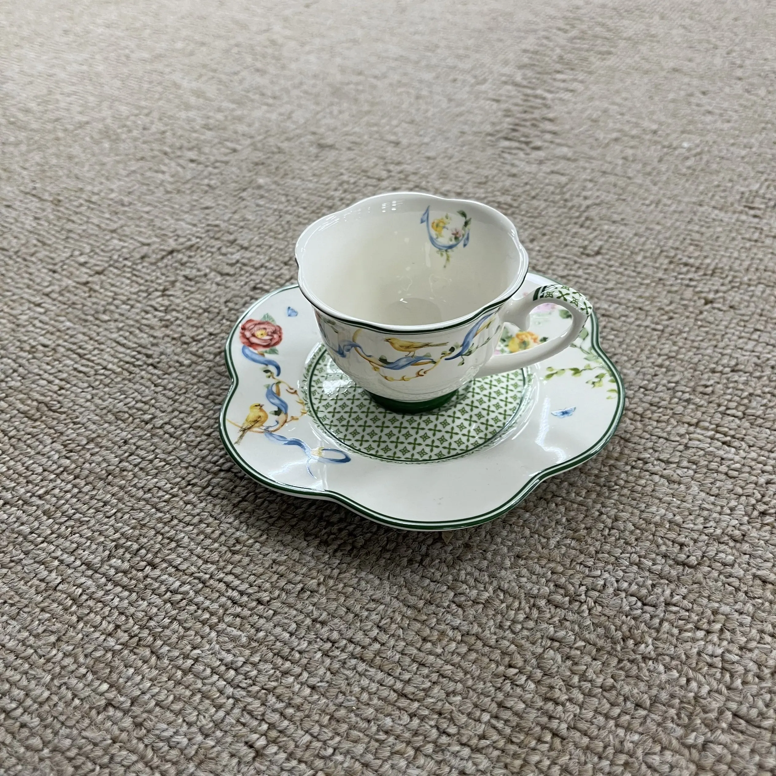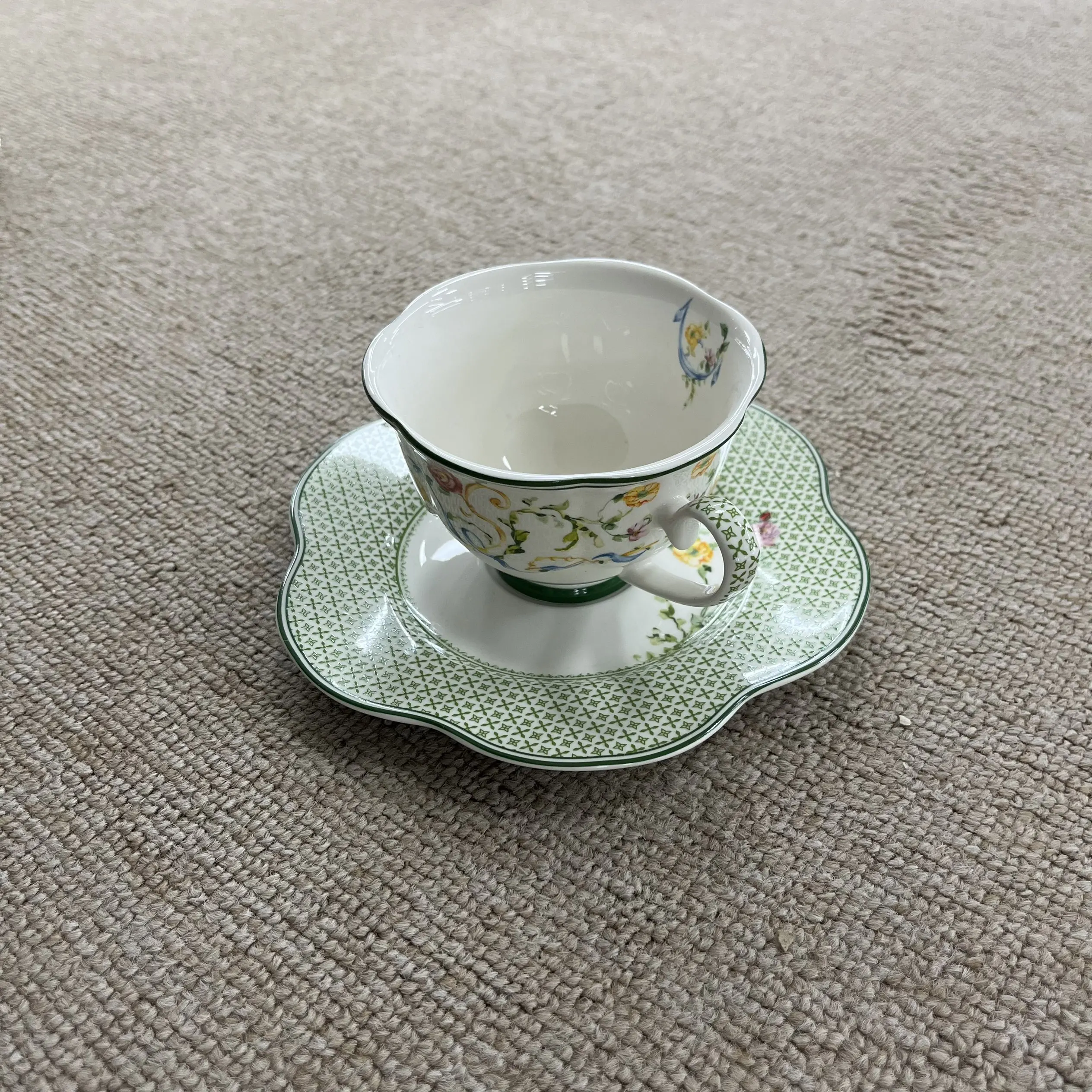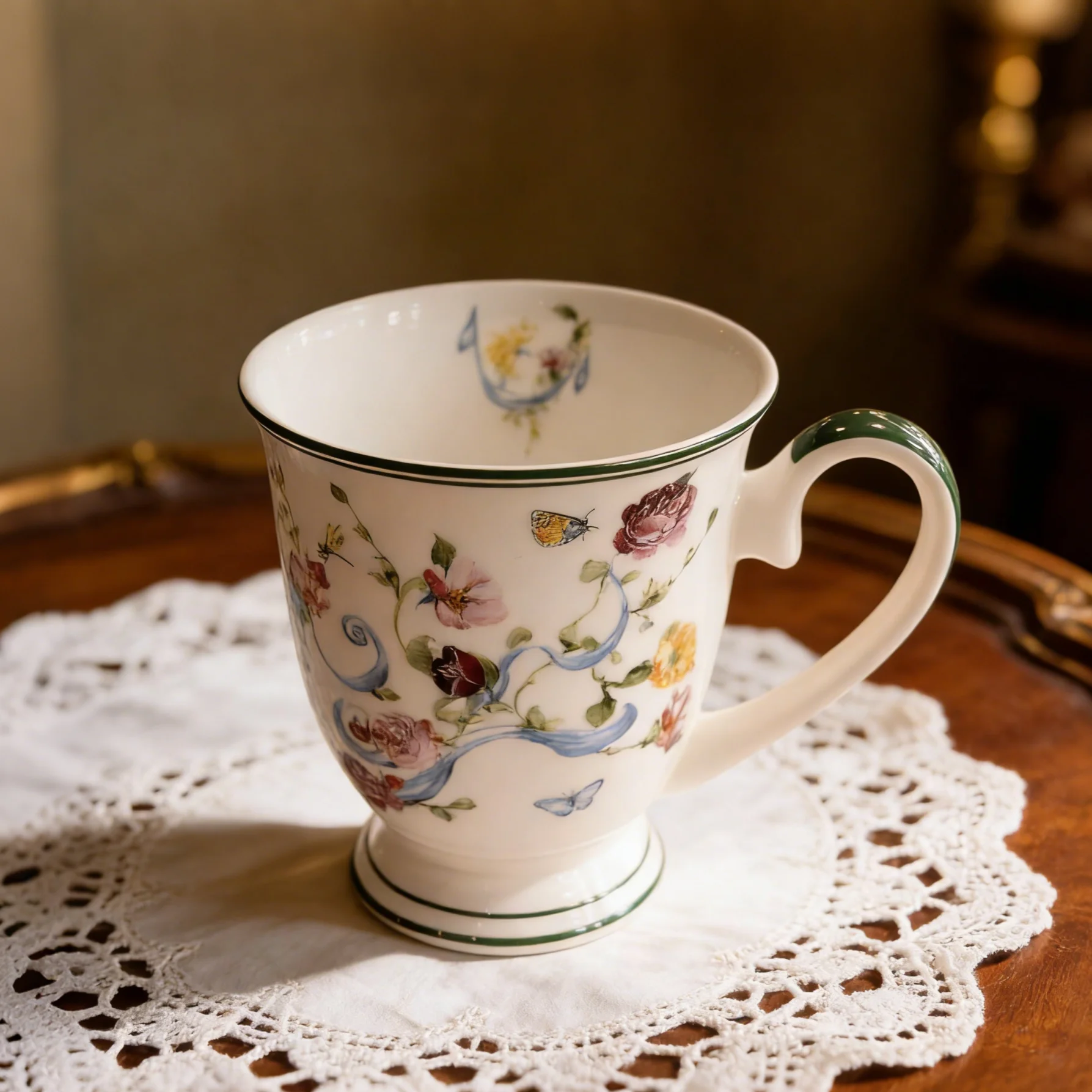 1. Σχέδιο & Τεχνουργία * Διακοσμημένο με λεπτά φλοράλ σχέδια και απαλούς πράσινους τόνους, τα φιμέ χείλη προσθέτουν ένα ρομαντικό, αγροτικό στοιχείο.