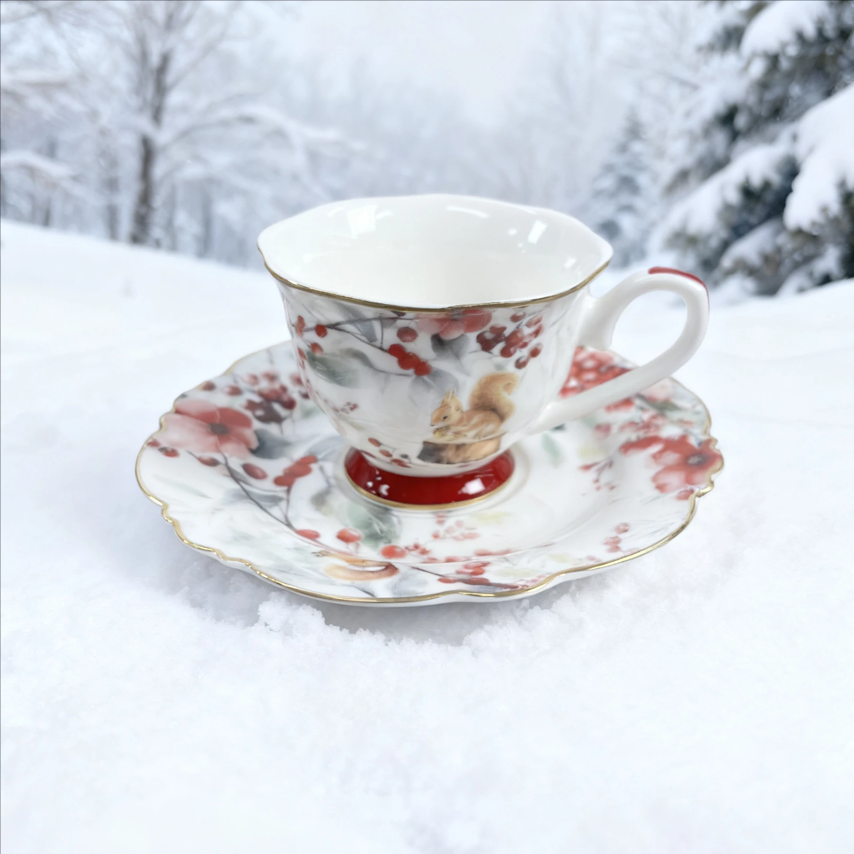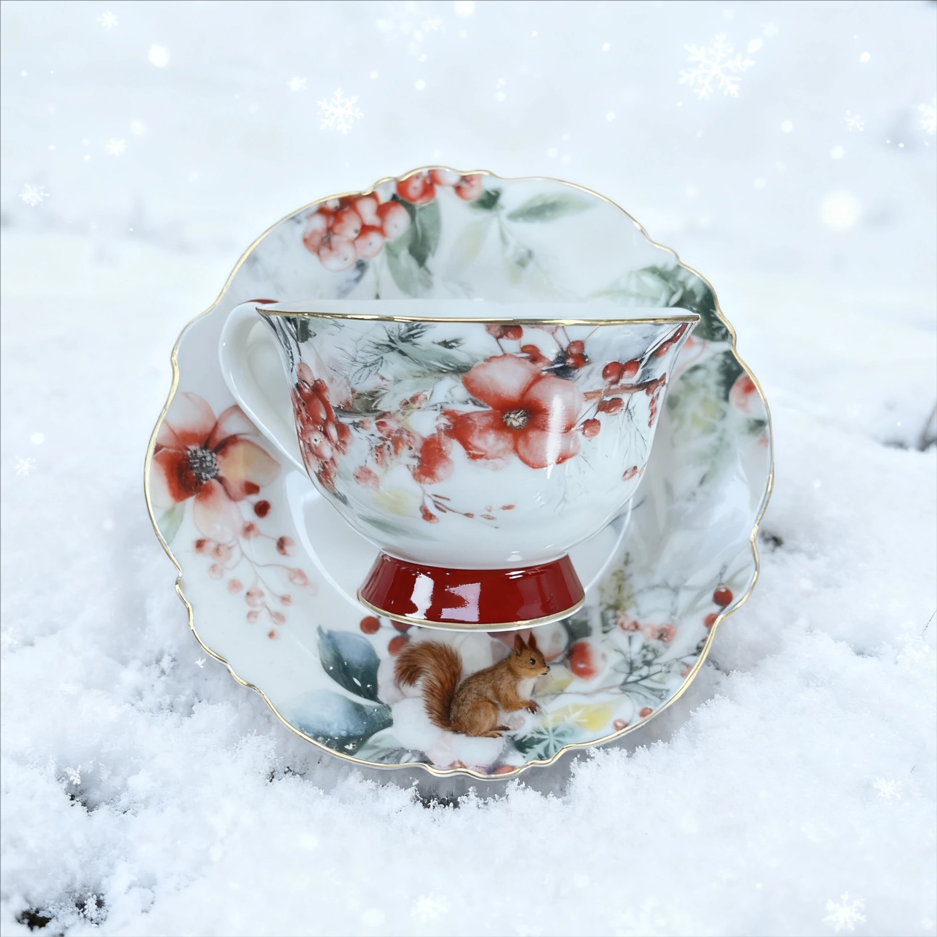 Φλιτζάνι πορσελάνης με θέμα τον χειμώνα και την ανθοφορία - Σκίουρος, κόκκινα μούρα & μοτίβο πουλιού με χρυσή λωρίδα (Ζεστό εορταστικό ποτήρι)